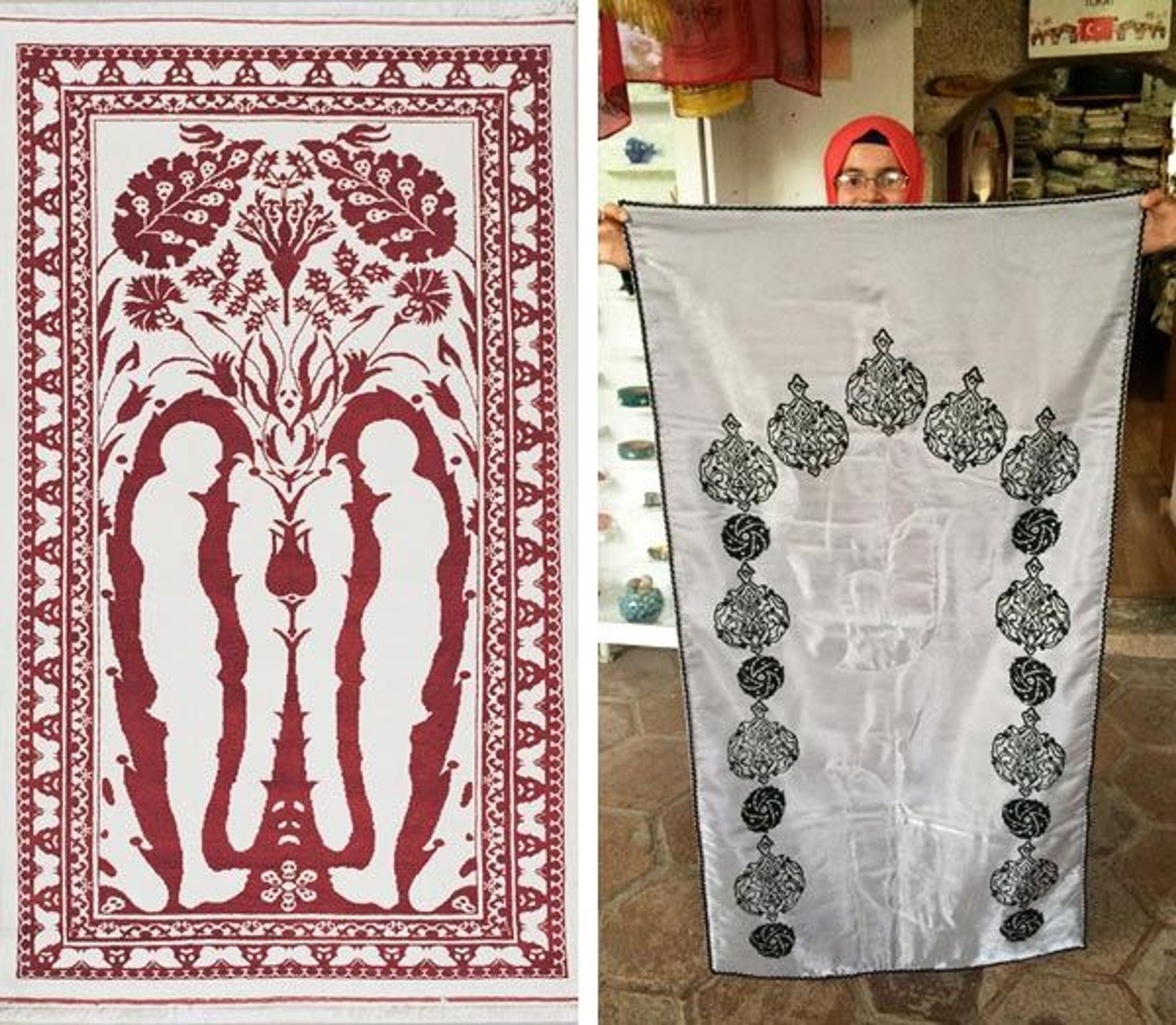 Left: Peter Hristoff. Untitled, 2005. Wool; 85 x 51 in. Collection of Ömer Özyürek. Right: A rug maker shows one of her pieces in a fabric shop in Tokat, Turkey, June 2015. Photo by the author