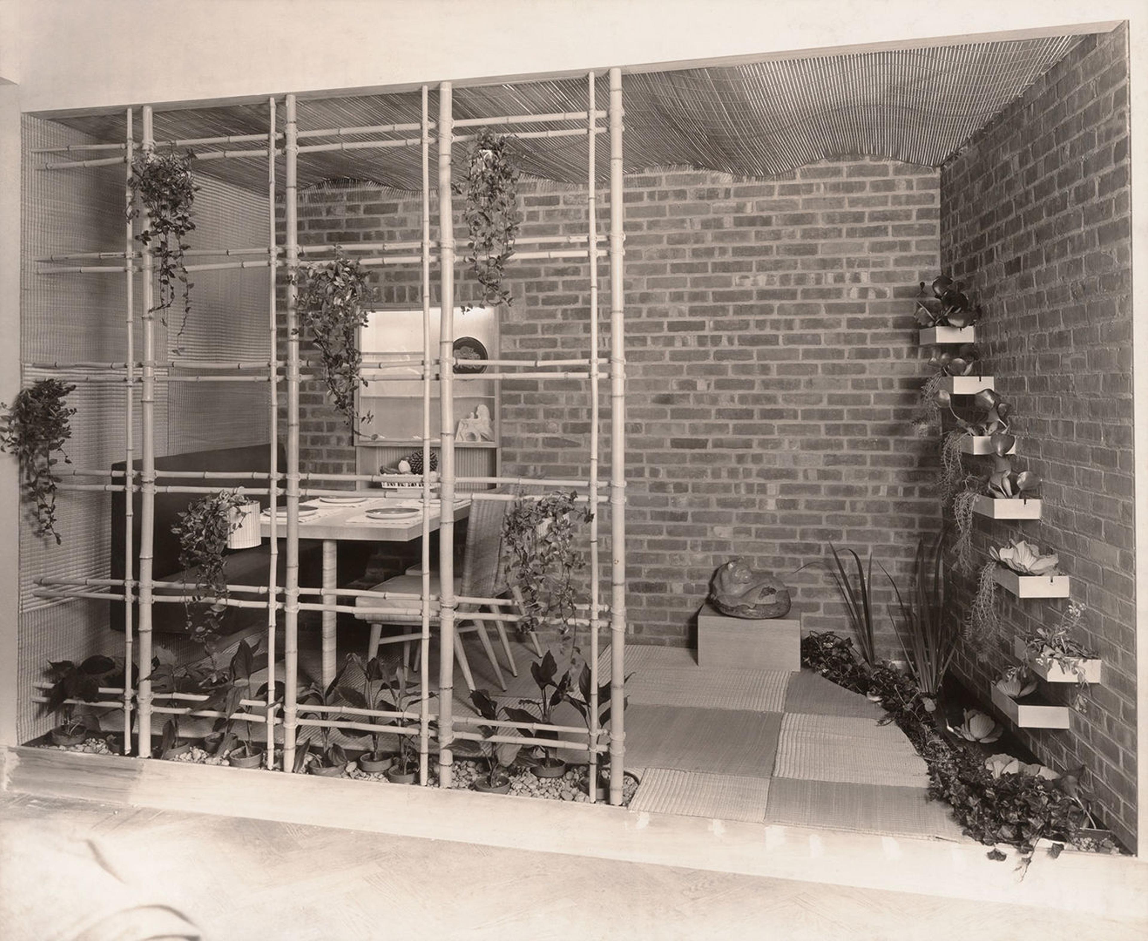 The fifteenth in the American Industrial Art series, Contemporary American Industrial Art, was held in 1940. As with previous shows, the exhibition was organized by a group of contemporary designers and architects, including Donald Deskey, Ralph Walker, and Walter Dorwin Teague. Edward D. Stone designed a dining alcove, which included a bamboo trellis with hanging plants and wall-mounted stepped containers with more potted plants.