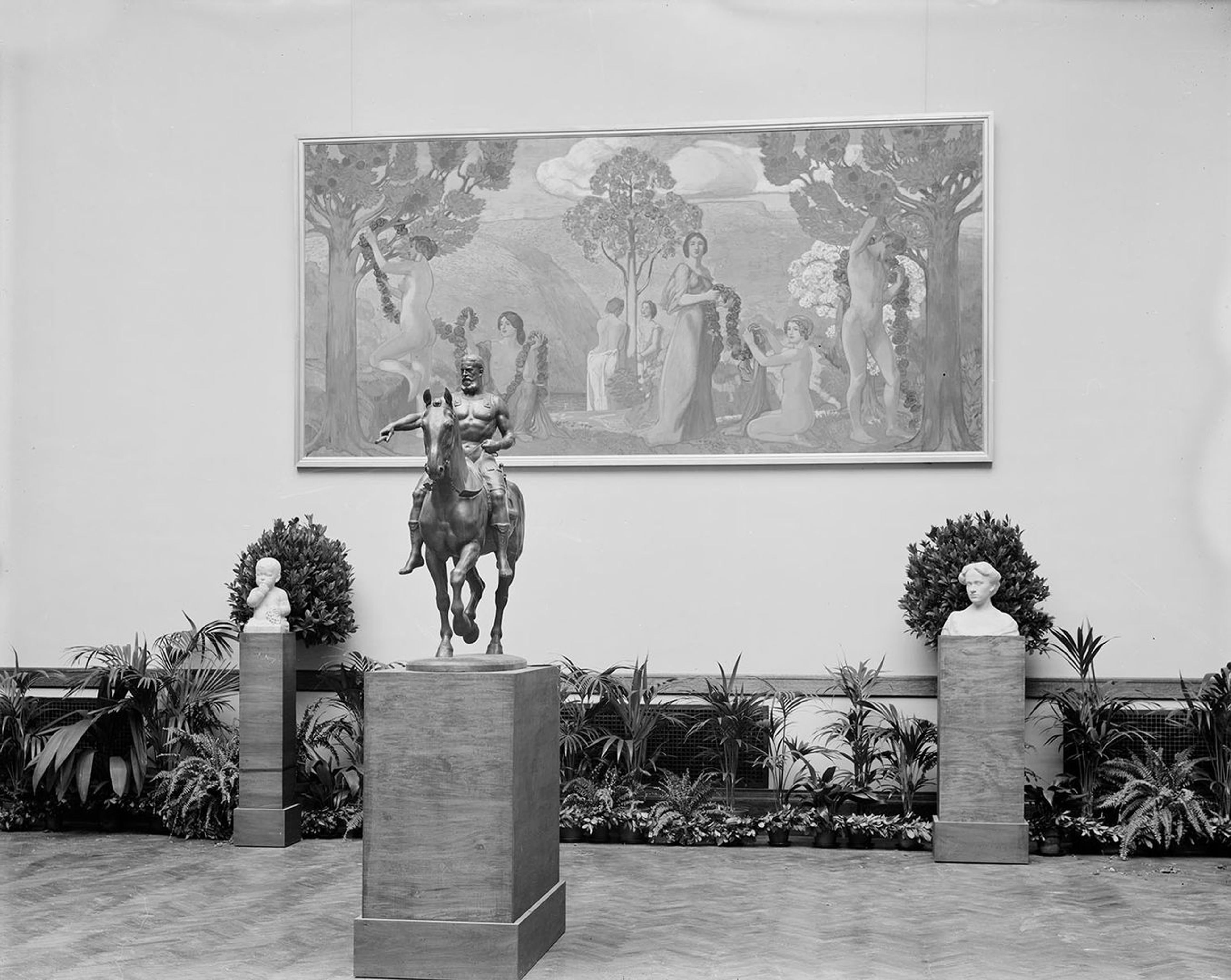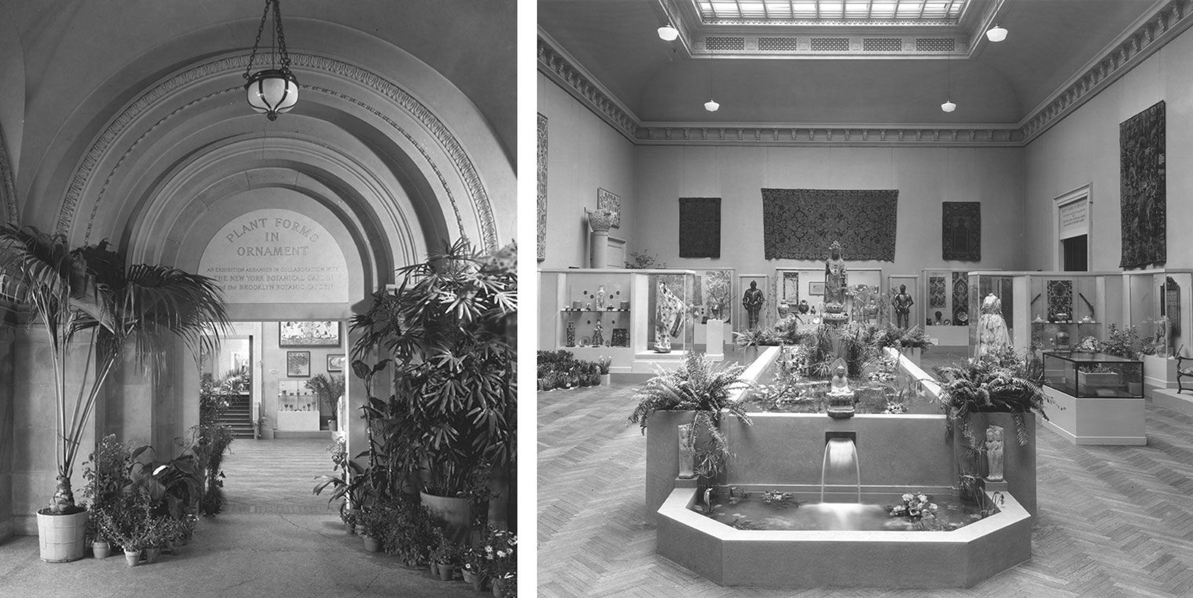 An early exhibition on Contemporary German Art in 1909 included a collection of potted plants and ferns on the floor along with several small potted trees. A few fallen leaves can be seen on the gallery floor in the lower right. In 1919 Plant Forms in Ornament opened, focusing on plant motifs used in textiles, prints, pottery, and metalwork from across Europe, North America, and Asia. The exhibition included a broad selection of living plants provided by the New York Botanical Garden. The exhibition catalogue lists papyrus, aloes, and some fifty palms as some of the plants that were placed throughout the gallery space. 1