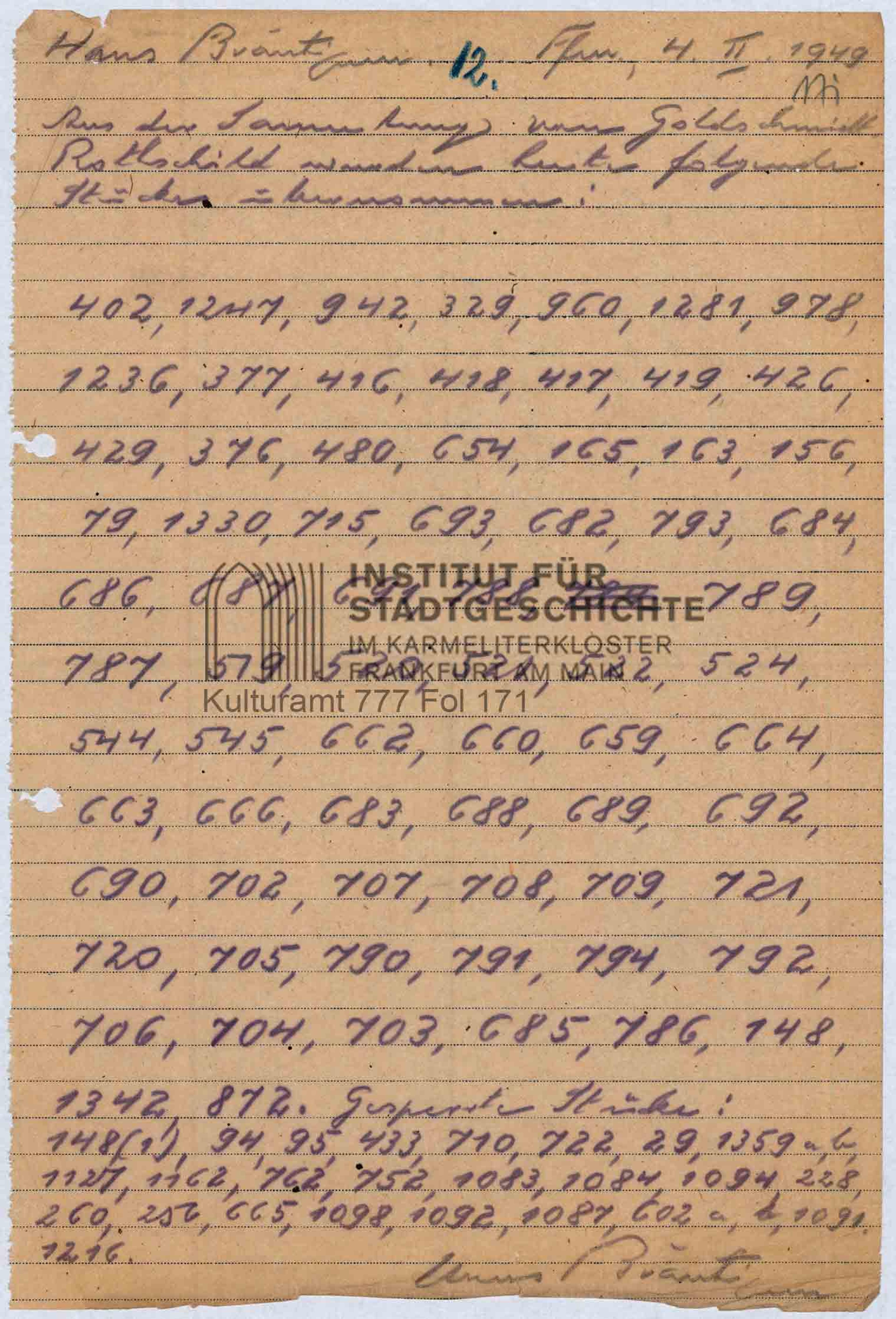 Hans Bräutigam, Frankfurt/Main, February 4, 1949. The text reads: "The following pieces were taken over from the collection von Goldschmidt-Rothschild today: (…). Blocked pieces: (…) 94, 95 (…)." Institut für Stadtgeschichte, Frankfurt (ISG_Kulturamt 777_Fol 171)
