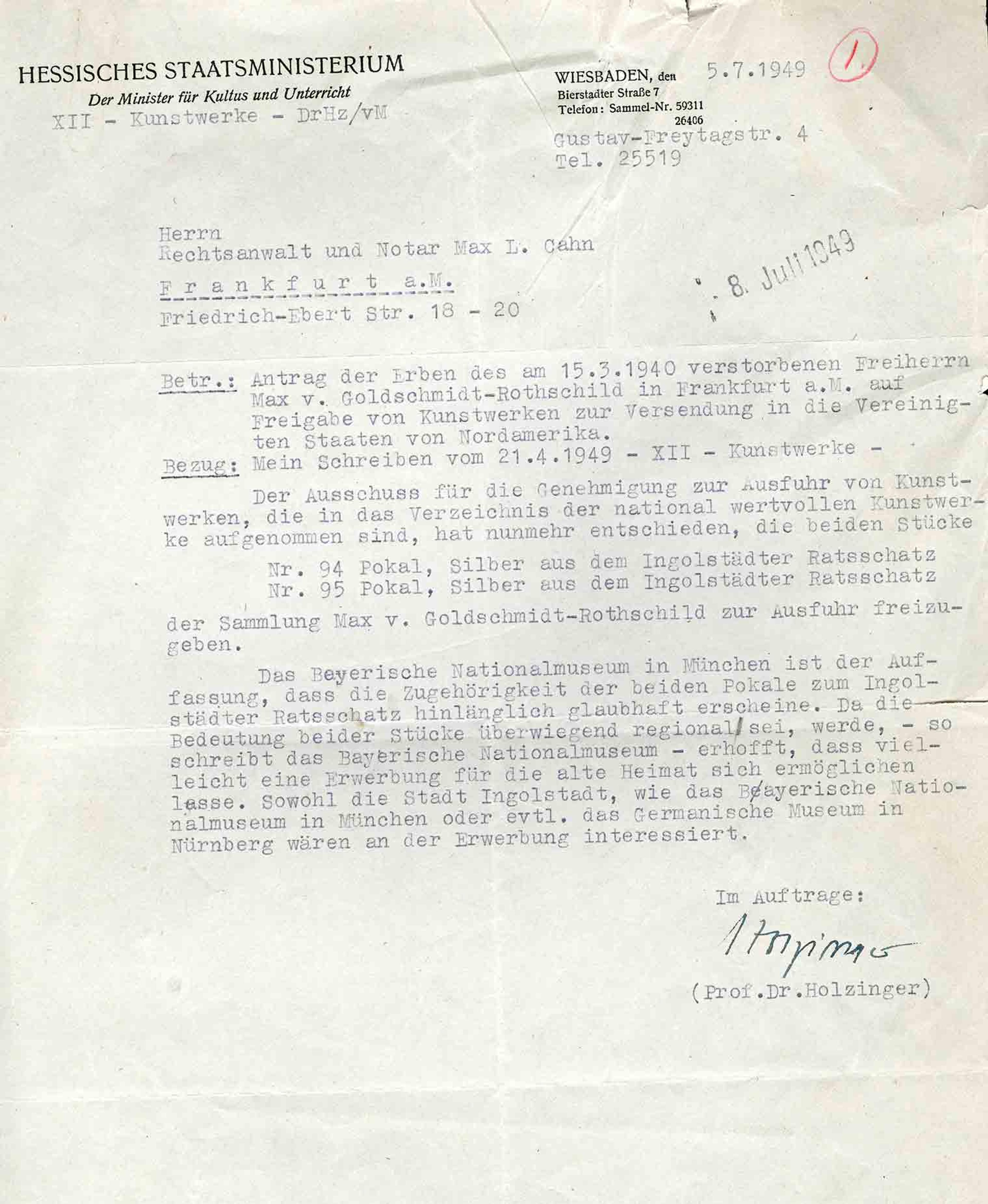 Letter from Prof. Dr. Holzinger, Hessisches Staatsminsterium, to Max L. Cahn, July 5, 1949. The Metropolitan Museum of Art Archives
