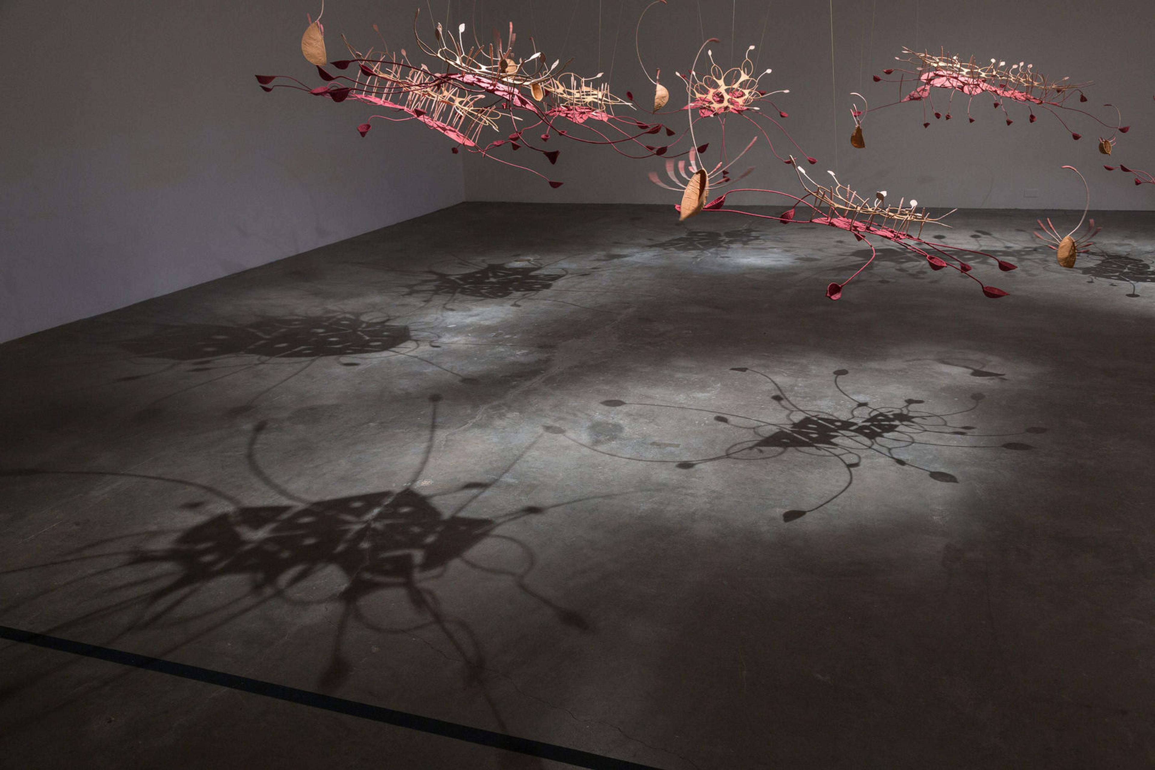 In staging Seven ponds and few raindrops in a way that is instantly immersive, Shettar engenders a deeply affective phenomenological encounter for the viewer within her installation. Occupying almost the entirety of the gallery space, the installation elegantly swirls up, from near the ground toward the ceiling, its elements caught mid-motion. In what has become somewhat of a signature gesture for the artist, the components are suspended in midair such that they seemingly defy gravity, and are dramatically lit to cast a series of spellbinding shadows. Together, this contributes to the sense of having stumbled upon a frozen moment of pure sublimity held within a hidden-away oasis.