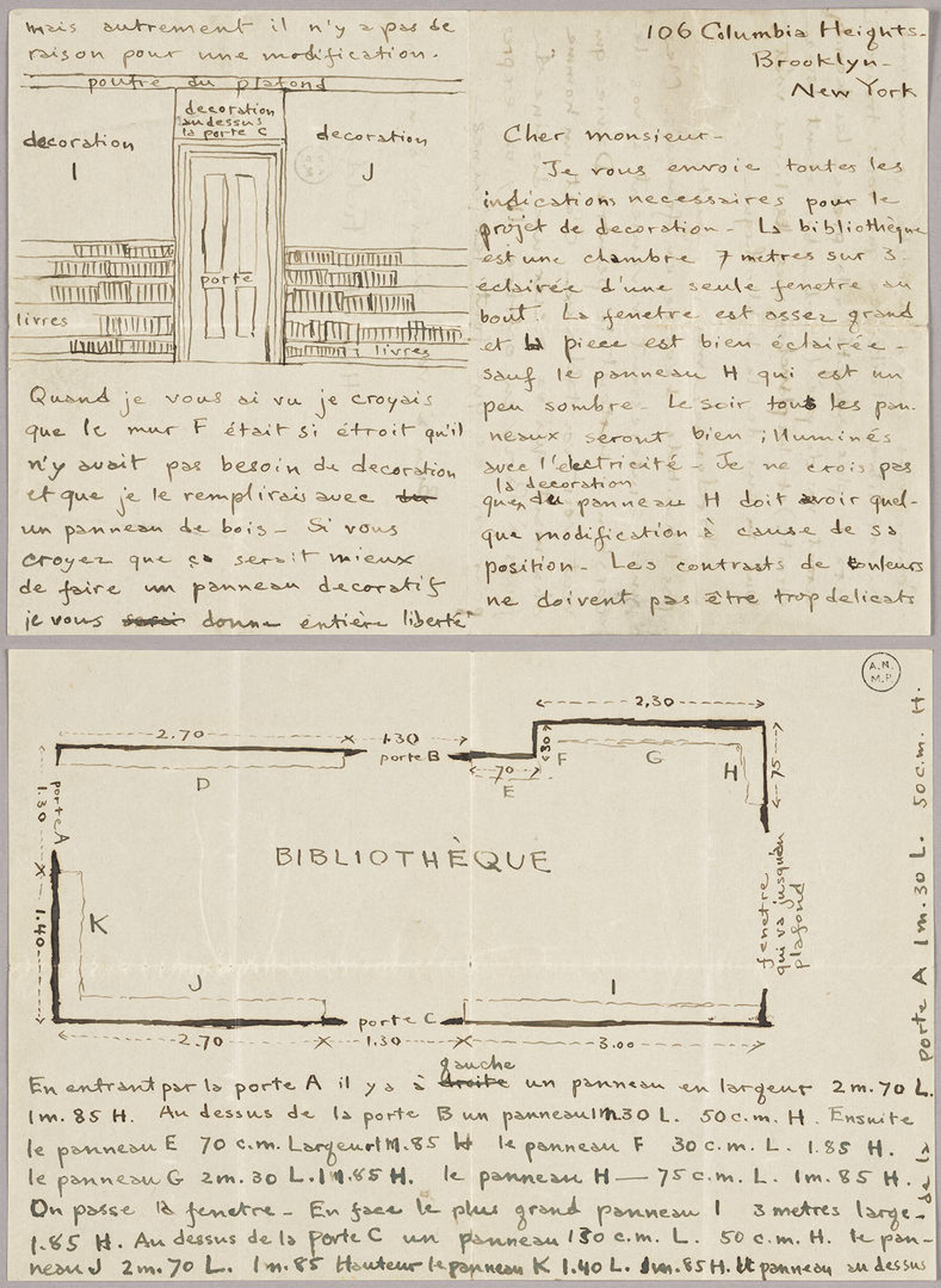 I started out by reexamining known archival documents to see what else could be gleaned from them, especially when paired with other materials. An important moment was looking at Field’s letter to Picasso, which is the only evidence of the commission remaining in the Picasso archive. I remember viewing it for the first time—it has been cited but not published until now—and scrutinizing not only Field’s writing, but also his renderings of the library’s elevation and floor plan. I immediately realized how vital these renderings were for understanding Field’s vision of Picasso’s paintings covering all available wall area in the room. The completed commission would have resulted in an immersive experience.