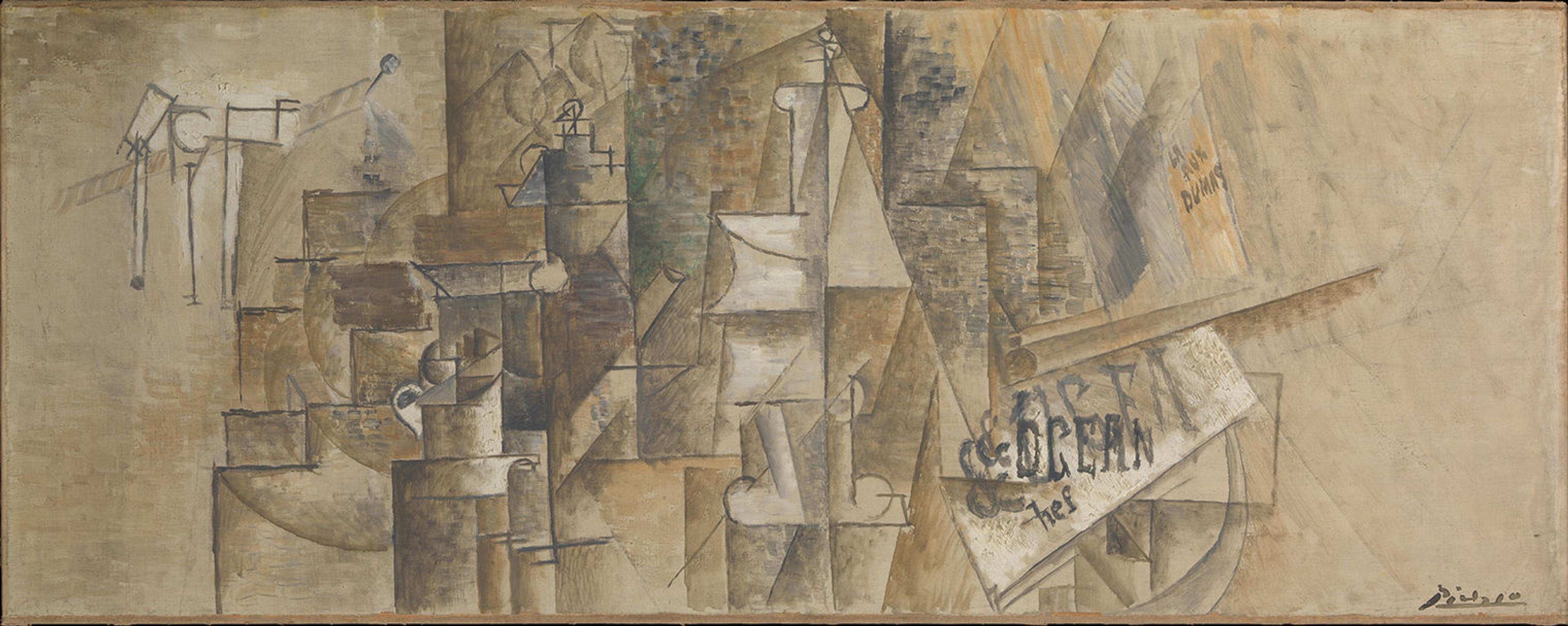 Pablo Picasso (Spanish, Málaga 1881–1973 Mougins, France) Pipe Rack and Still Life on a Table, Céret, summer 1911. Oil and charcoal on canvas 19 1∕2 × 50 in. (49.5 × 127 cm), irregular 20 × 50 1∕4 in. (50.8 × 127.6 cm), mounted The Metropolitan Museum of Art, New York, The Mr. and Mrs. Klaus G. Perls Collection, 1997 (1997.149.6) © 2023 Estate of Pablo Picasso / Artists Rights Society (ARS), New York