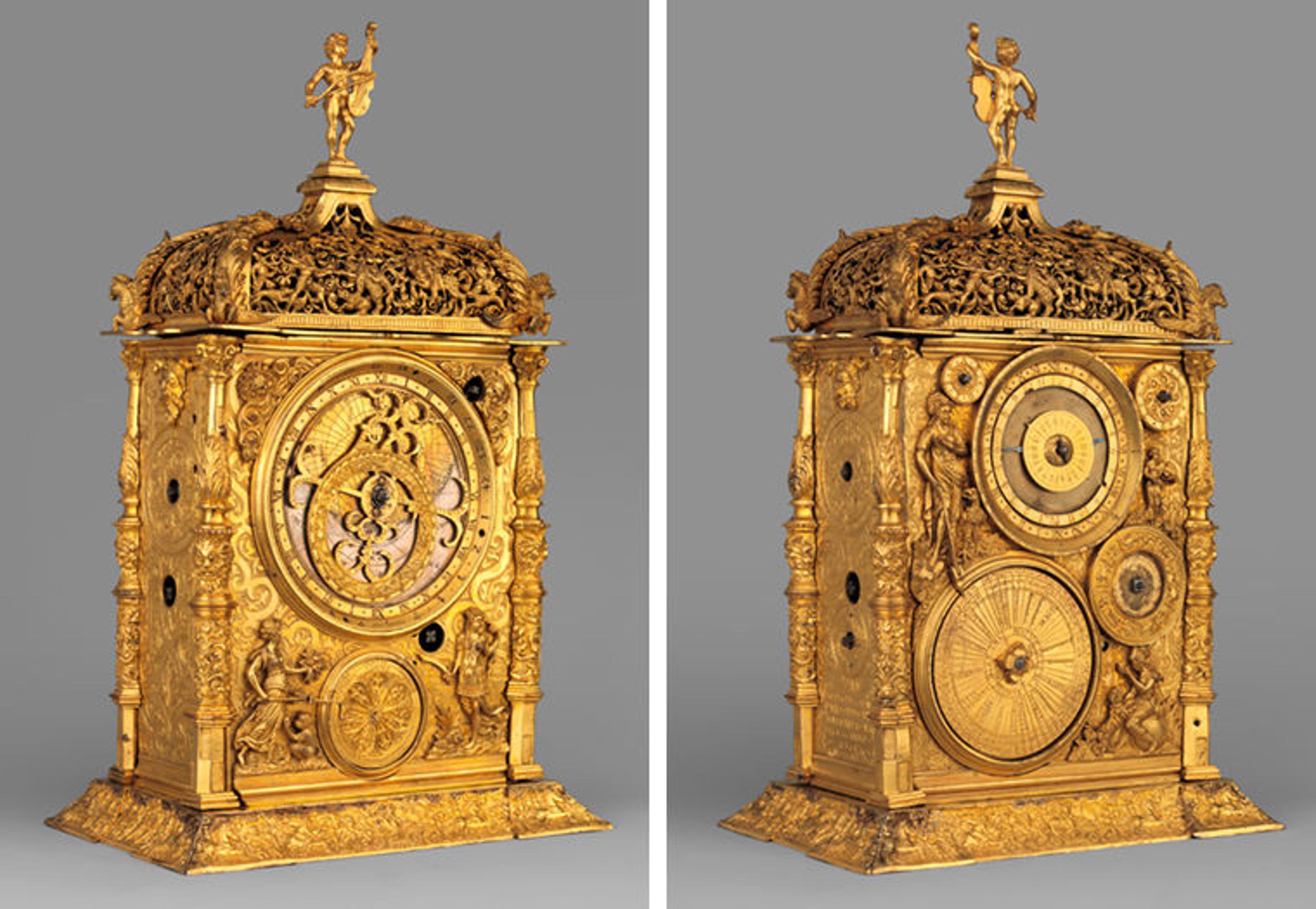 Movement probably by Jeremias Metzger (German, ca. 1525–ca. 1597). Astronomical table clock, 1568. German, Augsburg. Gilded brass, iron, 14 1/4 x 8 1/2 x 5 3/4 in. (36.2 x 21.6 x 14.6 cm). The Metropolitan Museum of Art, New York, Gift of J. Pierpont Morgan, 1917 (17.190.634a–d)
