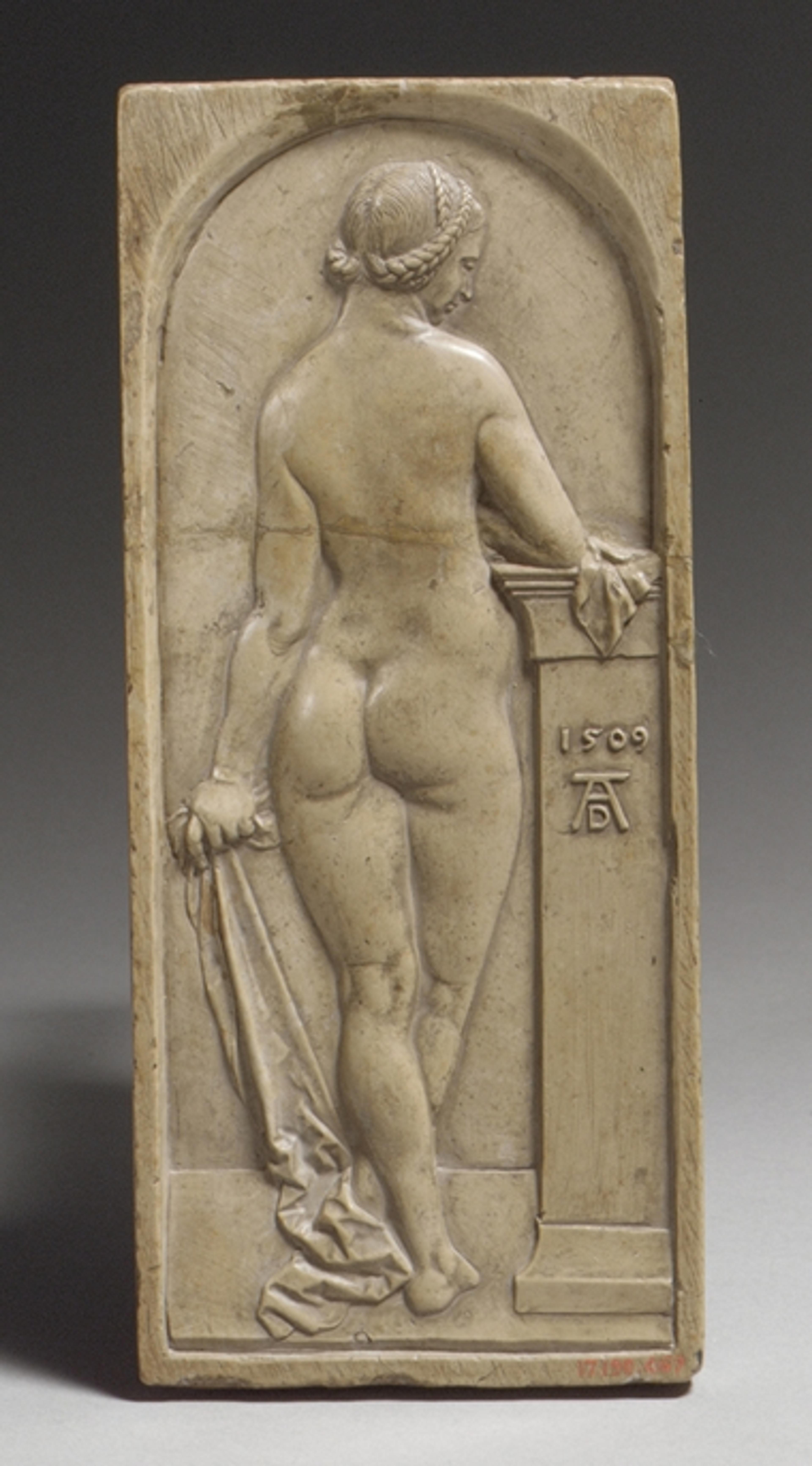 Right: After a composition by Albrecht Dürer (German, 1471–1528). Female Nude Seen from Behind, early 17th century. German. Honestone, 6 x 2 5/8 in. (15.2 x 6.7 cm). The Metropolitan Museum of Art, New York, Gift of J. Pierpont Morgan, 1917 (17.190.467)