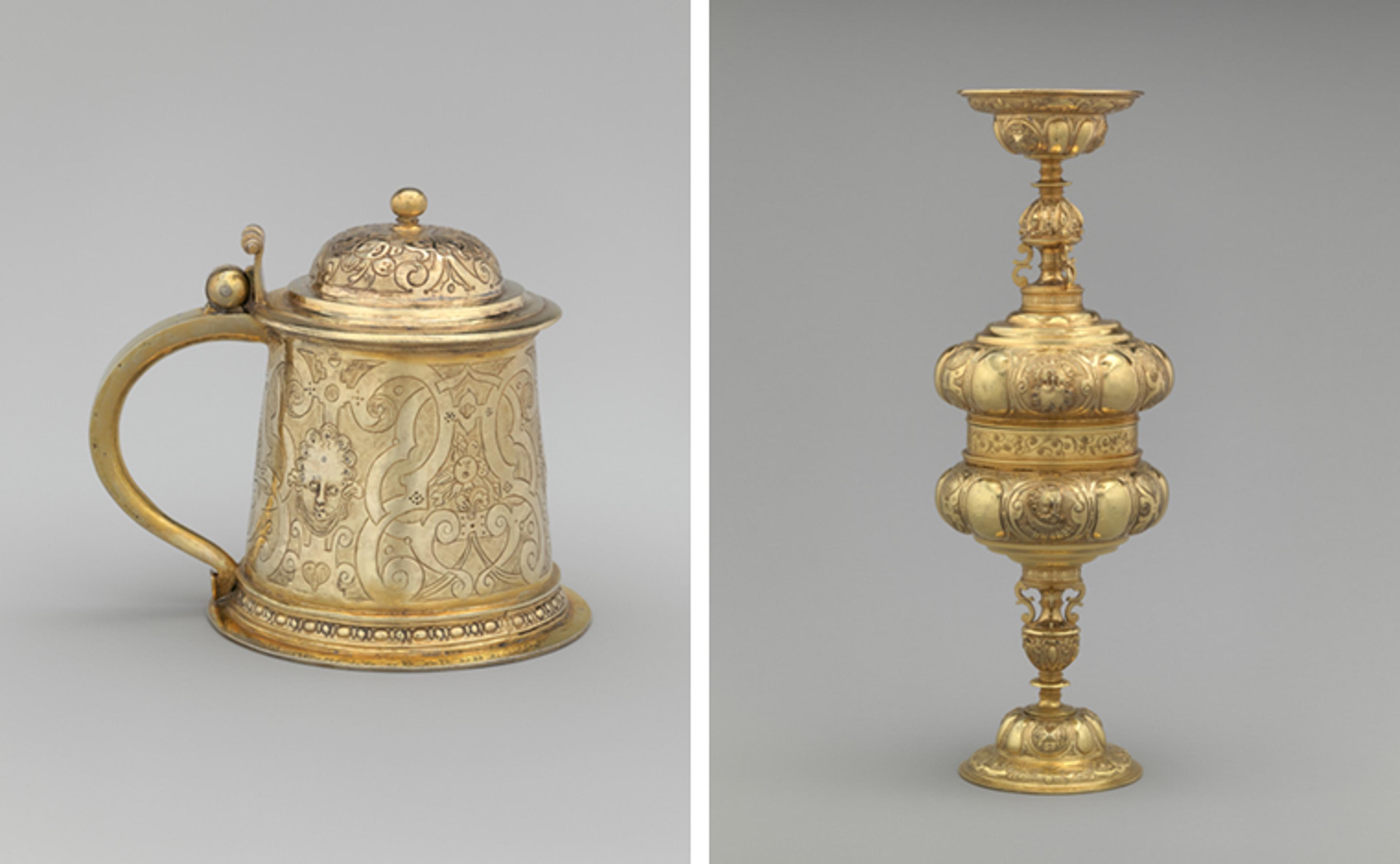 Left: Probably Abraham Riederar, the Elder (German, ca. 1546/7–1625). Tankard, ca. 1580–85. German, Augsburg. Gilded silver, 4 in. (10.2 cm). The Metropolitan Museum of Art, New York, Purchase, Rogers Fund, 1911 (11.93.16). Right: Probably Simon Pissinger (active 1582–1609). Two double standing cups (trussing cups), ca. 1600. German, Regensburg. Gilded silver, 11 5/8 in. (29.5 cm). The Metropolitan Museum of Art, New York, Purchase, Rogers Fund, 1911 (11.93.15a, b)