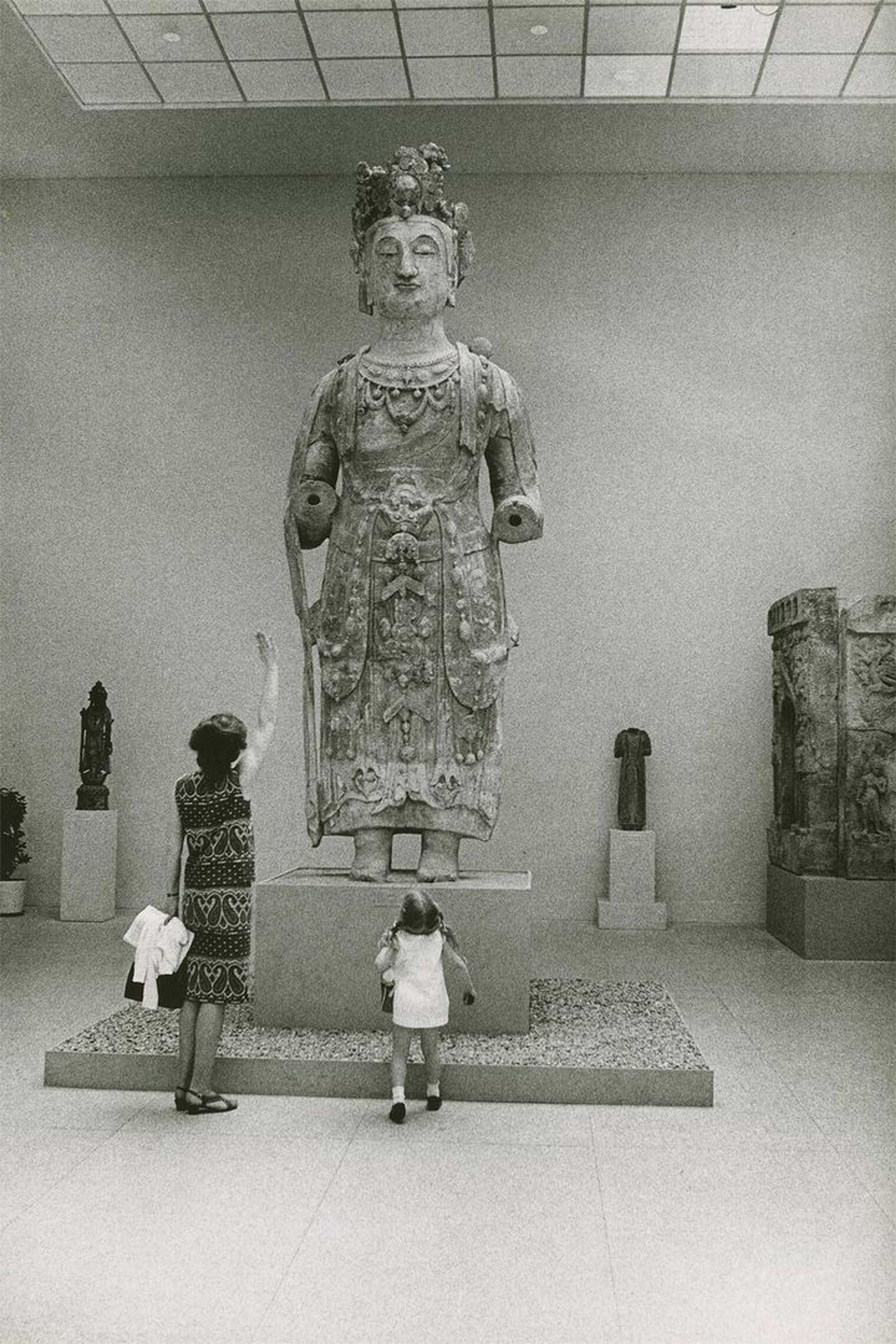 Source photograph for Centennial Certificate MMA showing a female and child in front of large female stone statue at The Metropolitan Museum of Art. Robert Rauschenberg papers. Robert Rauschenberg Foundation Archives, New York. Photo: Adelaide de Menil