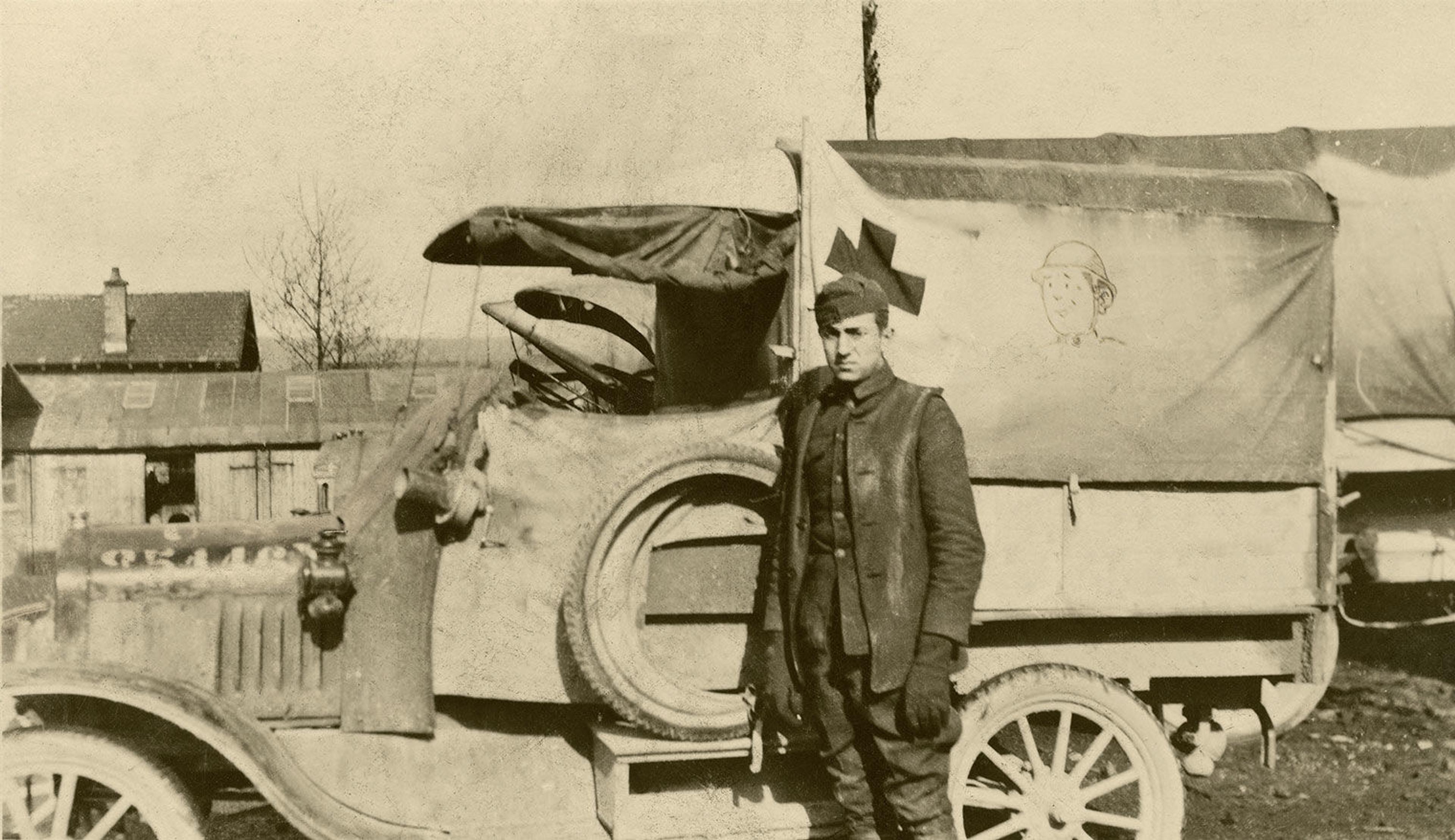 Walt Disney in front of an ambulance he decorated with a “doughboy” cartoon (France, early 1919). Photograph courtesy Walt Disney Archives Photo Library