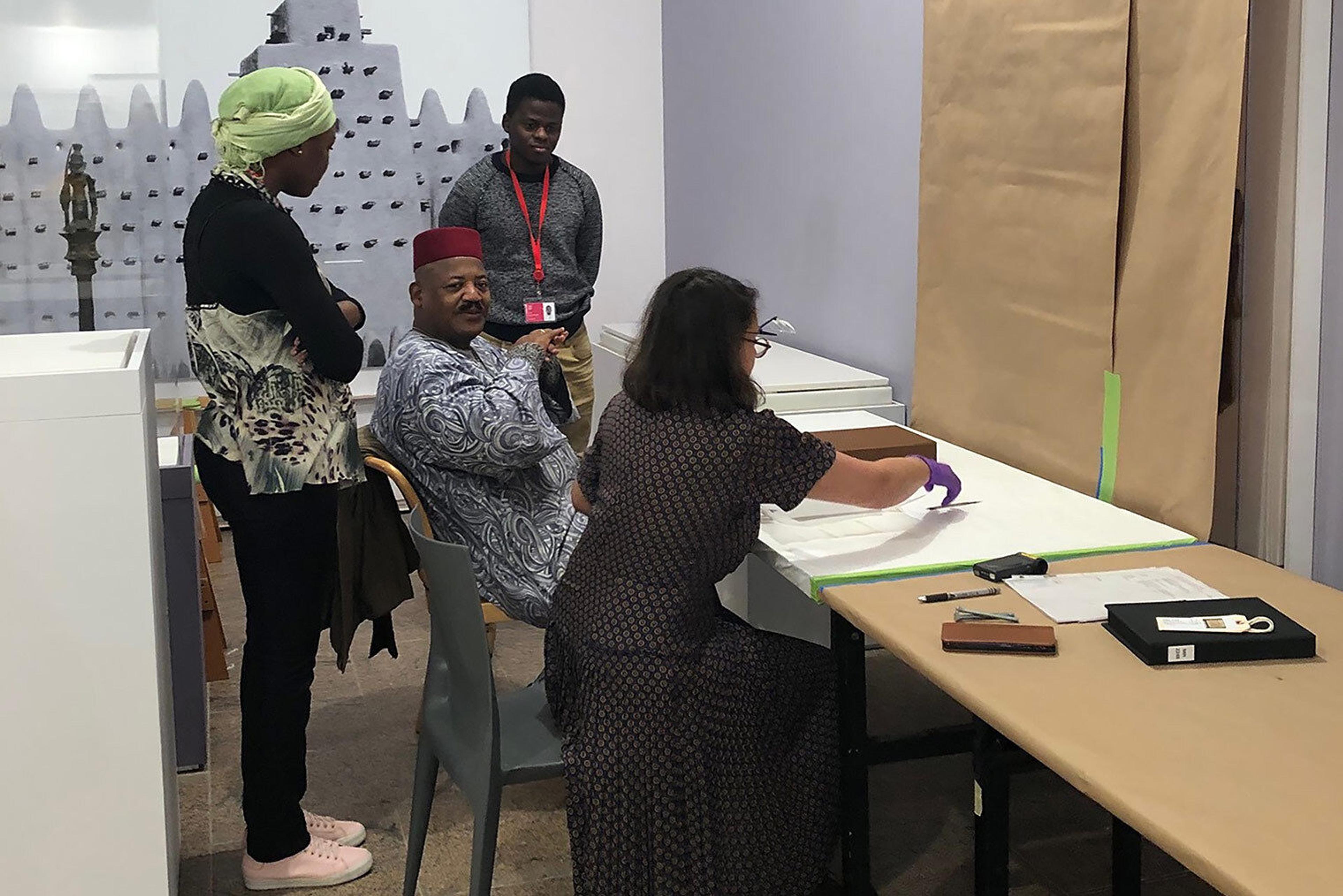 Oumy Mbaye (left) and Mouhamet Traoré (center) speak with Abdel Kader Haidara, custodian of the Mamma Haidara Memorial Library in Timbuktu, Mali, and Marina Ruiz-Molina, a paper conservator at The Met.