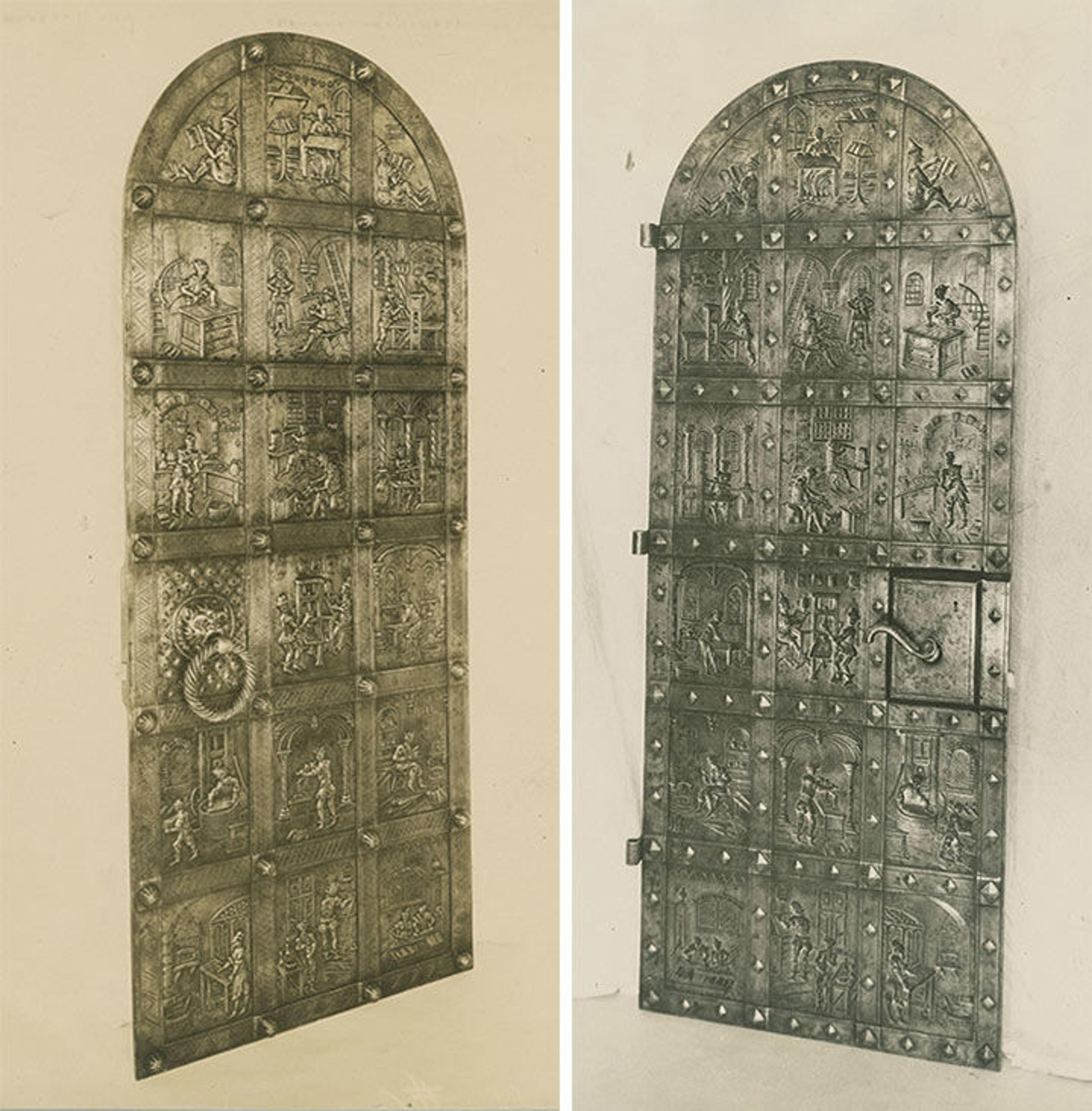 As a student of ironworking history and technique, Yellin collected examples of historic metalwork and rare art books. Clare Yellin, Samuel's granddaughter, told The Met that her grandfather's library included research materials on medieval art, the Italian Renaissance, Spanish art, the French Enlightenment, Art Nouveau, the Arts and Crafts movement, the history of ornament, and pattern books. These sources may have been used by Yellin and Mr. Winze for the design of this door, as the images depicted on the door are derived from early books and prints.