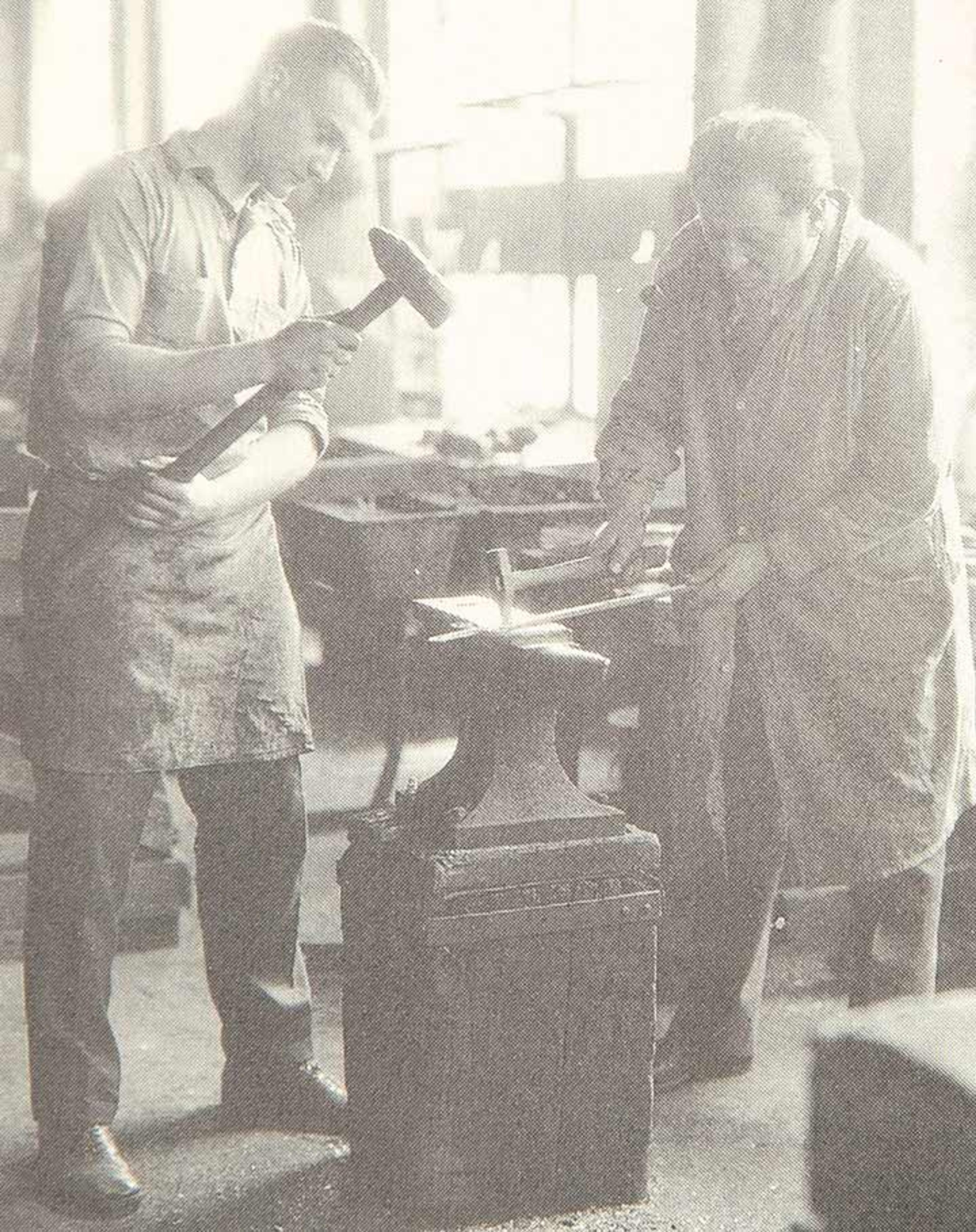 Yellin working with his striker (forging assistant) to prepare a demonstration piece at Arch Street forge, 1927. From Samuel Yellin, Metalworker
