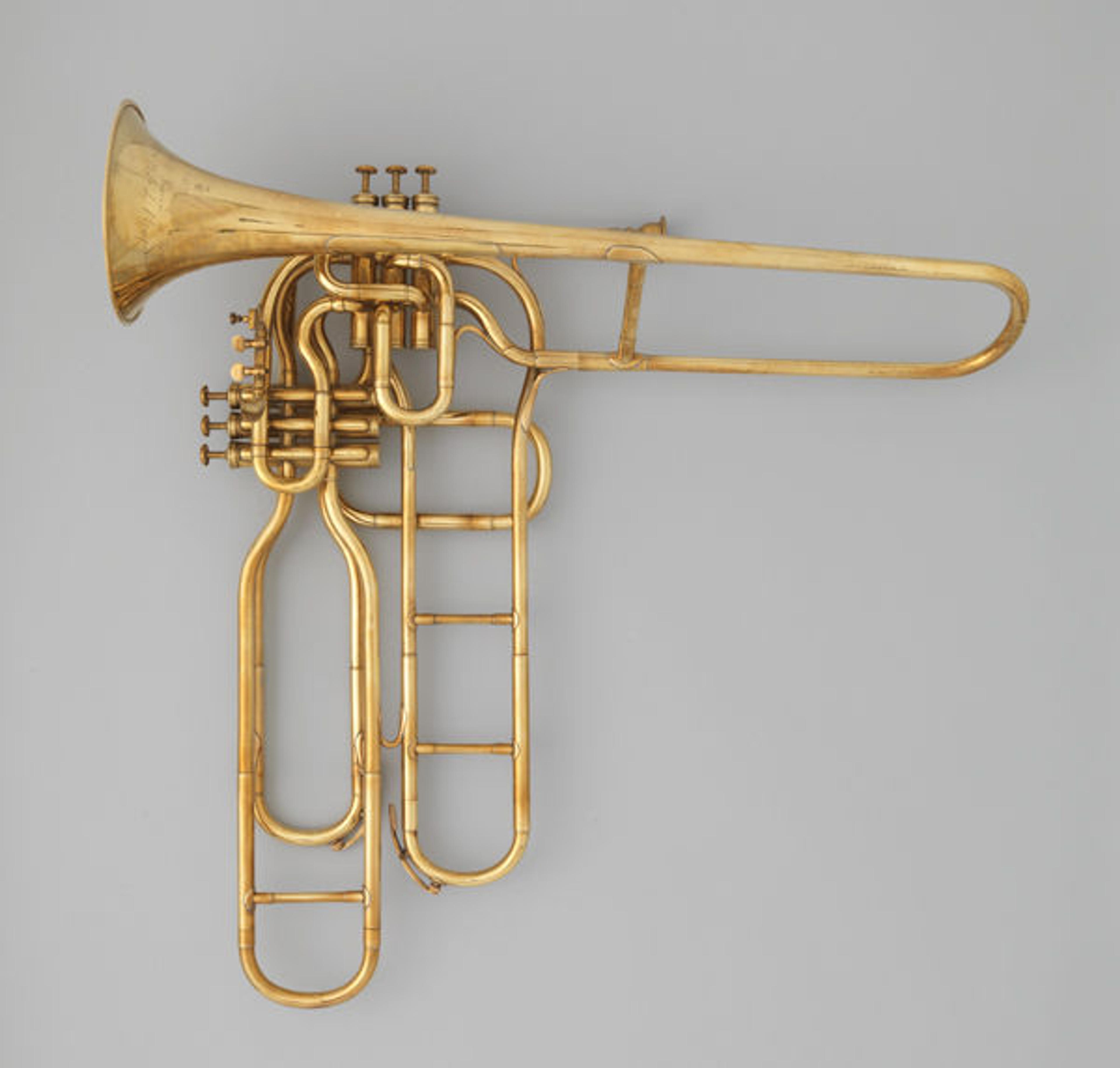 Adolphe (Antoine Joseph) Sax (Belgian, 1814–1894). Valve trombone, ca. 1863. Brass, white metal, cork. The Metropolitan Museum of Art, New York, Purchase, Amati Gifts, 2014 (2014.488a–d). Sax's system of six independent valves was devised to correct the intonation problems encountered with typical three-valve instruments, which can sound out of tune when valves are played in combination. Valve trombones were ideal in situations when using a slide was awkward, such as while marching or playing in a cramped orchestra pit.