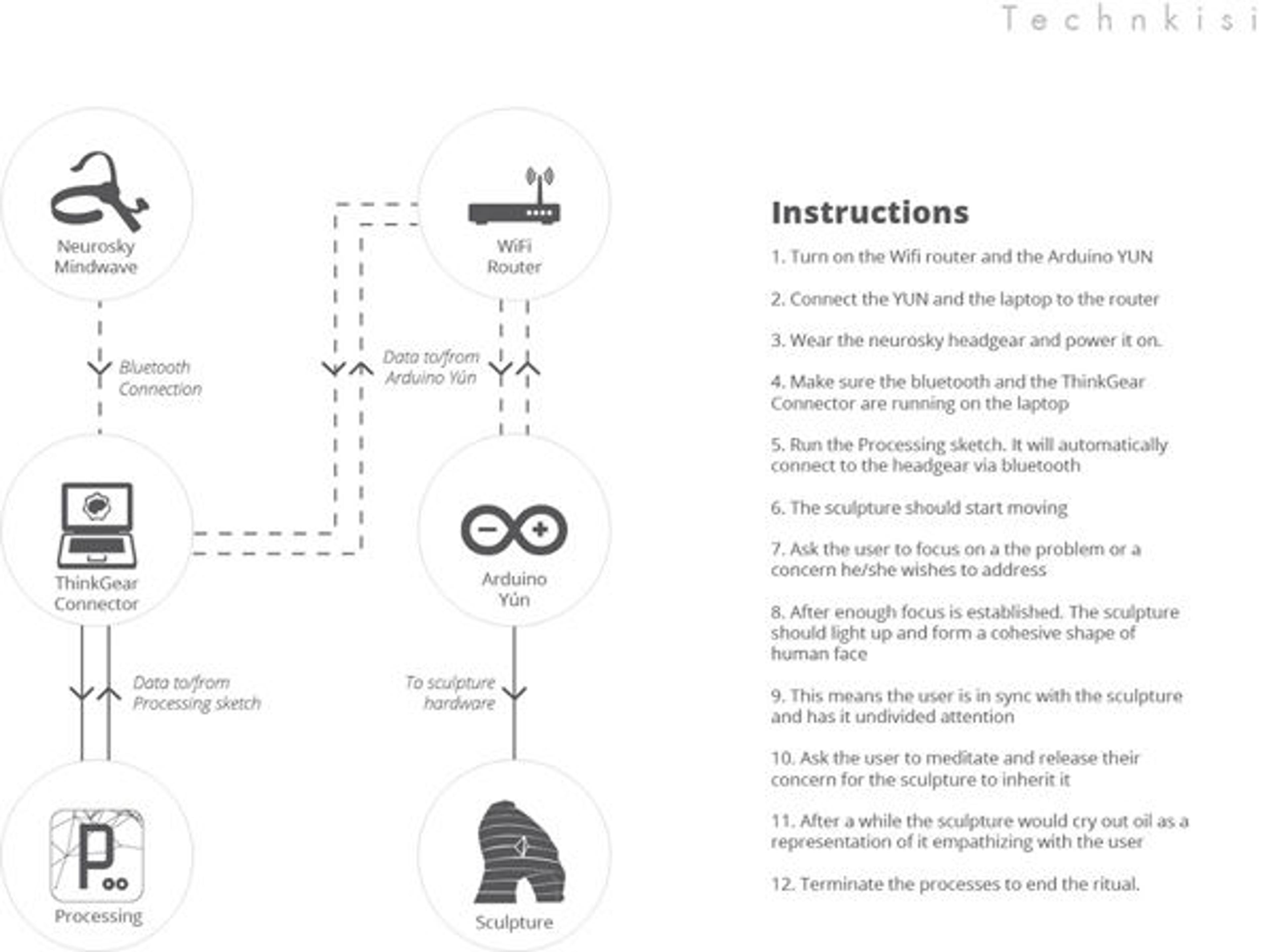 The sculpture is powered by a Neurosky MindWave, a brain-computer interface (BCI), connected to Thinkgear Connector on a laptop. Processing, an open-source programming language, processes the Neurosky MindWave data on the laptop and then translates the phases of the ritual to an Arduino Yun. The Arduino Yun controls the rotation of the four servo motors with the translated phases.