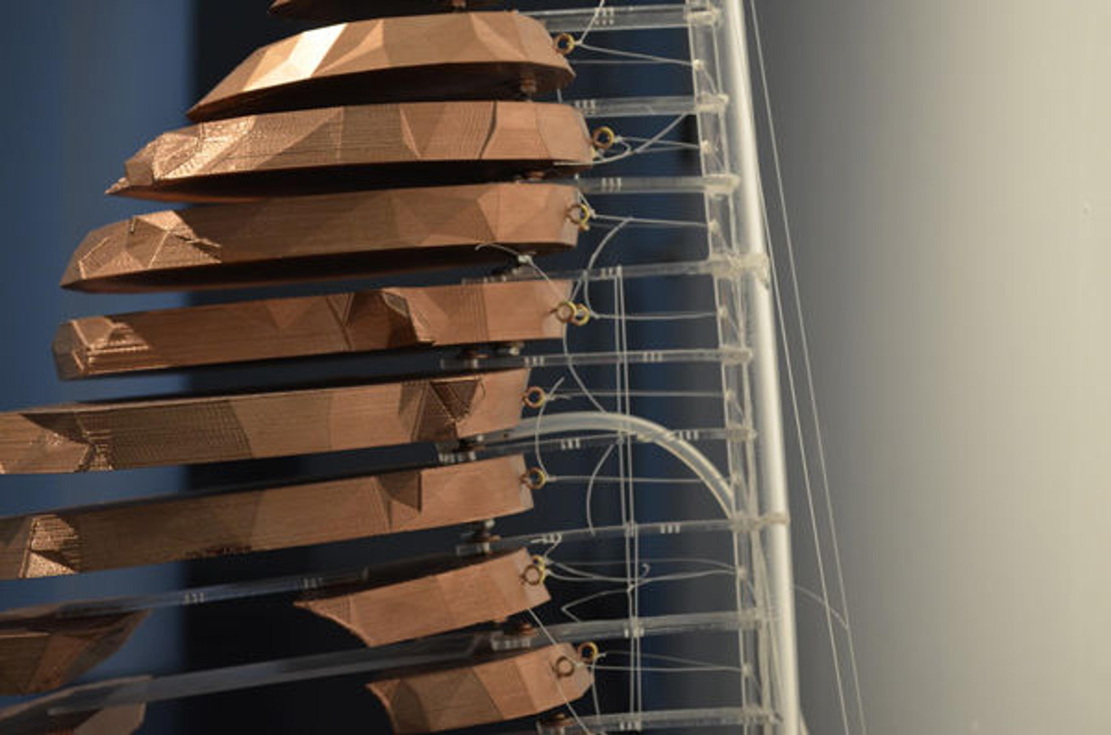 To make the sculpture look more robotic, I spray painted the layers with a metallic copper finish and constructed a plexiglass spine to hold the layers in place. To give the layers the ability to pull away from the spine in different directions, I mounted two hooks on the back of each layer to which I tied a set of transparent fishing wires connected to servo motors.