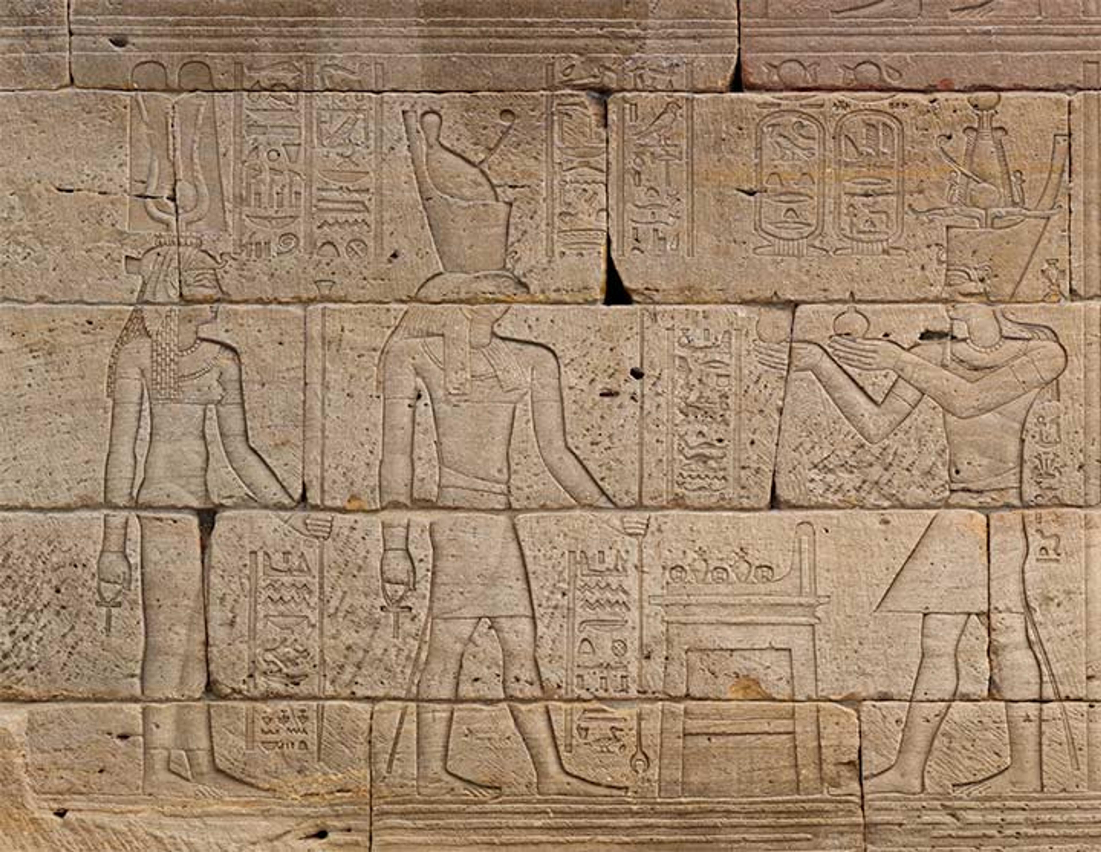Augustus (on the right) offers jars of wine to the deities Harendotes (center) and Hathor (left).