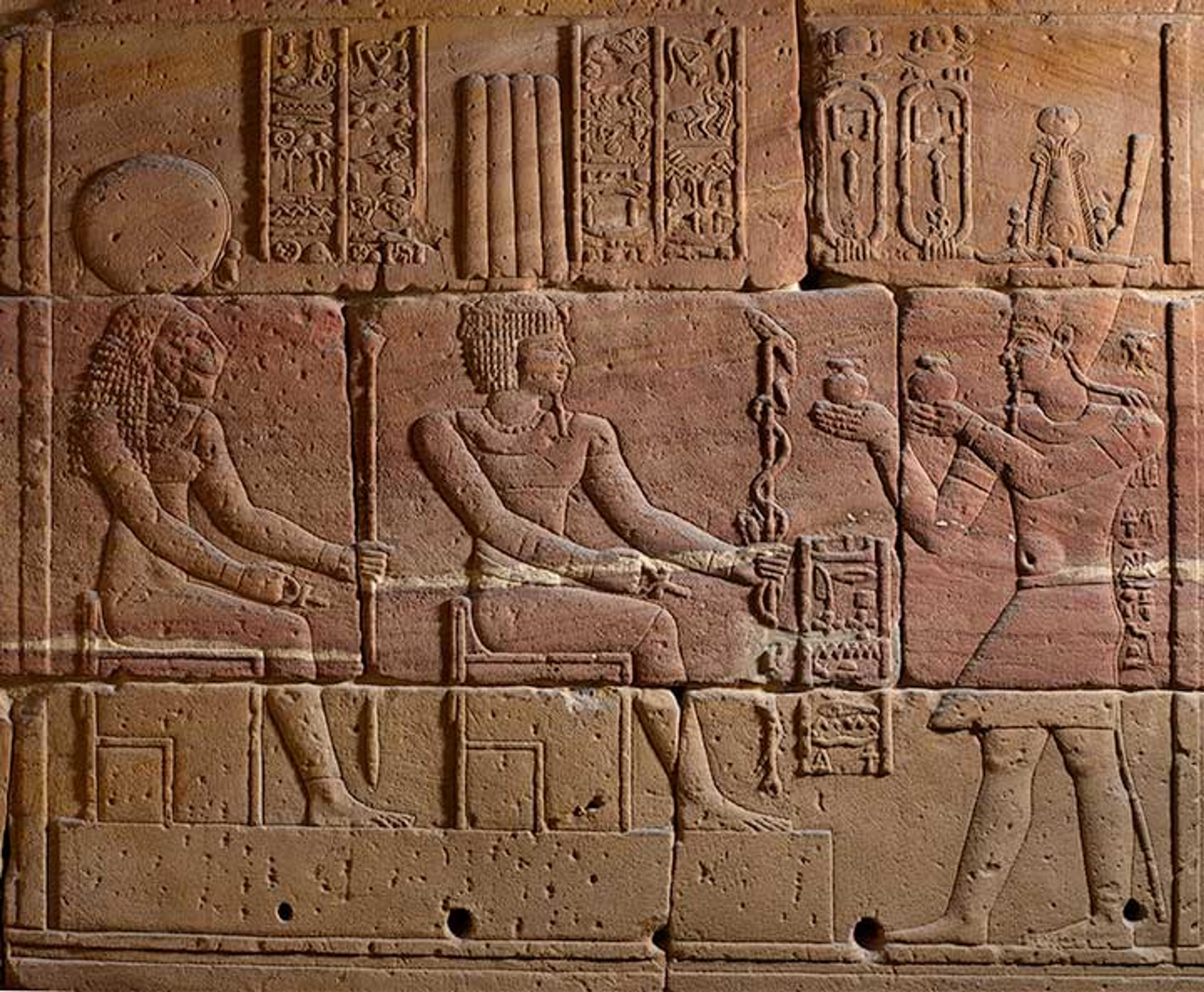 In this scene on the temple, Augustus is shown worshipping two brothers named Pihor and Pedesi. Pihor is on the right, wearing a headdress with a cobra called a uraeus [yoo-RAY-us]. Above his head is a sun disk. Pedesi wears both a uraeus and a tall crown with ostrich feathers on either side. They both hold an ankh, a symbol of life.