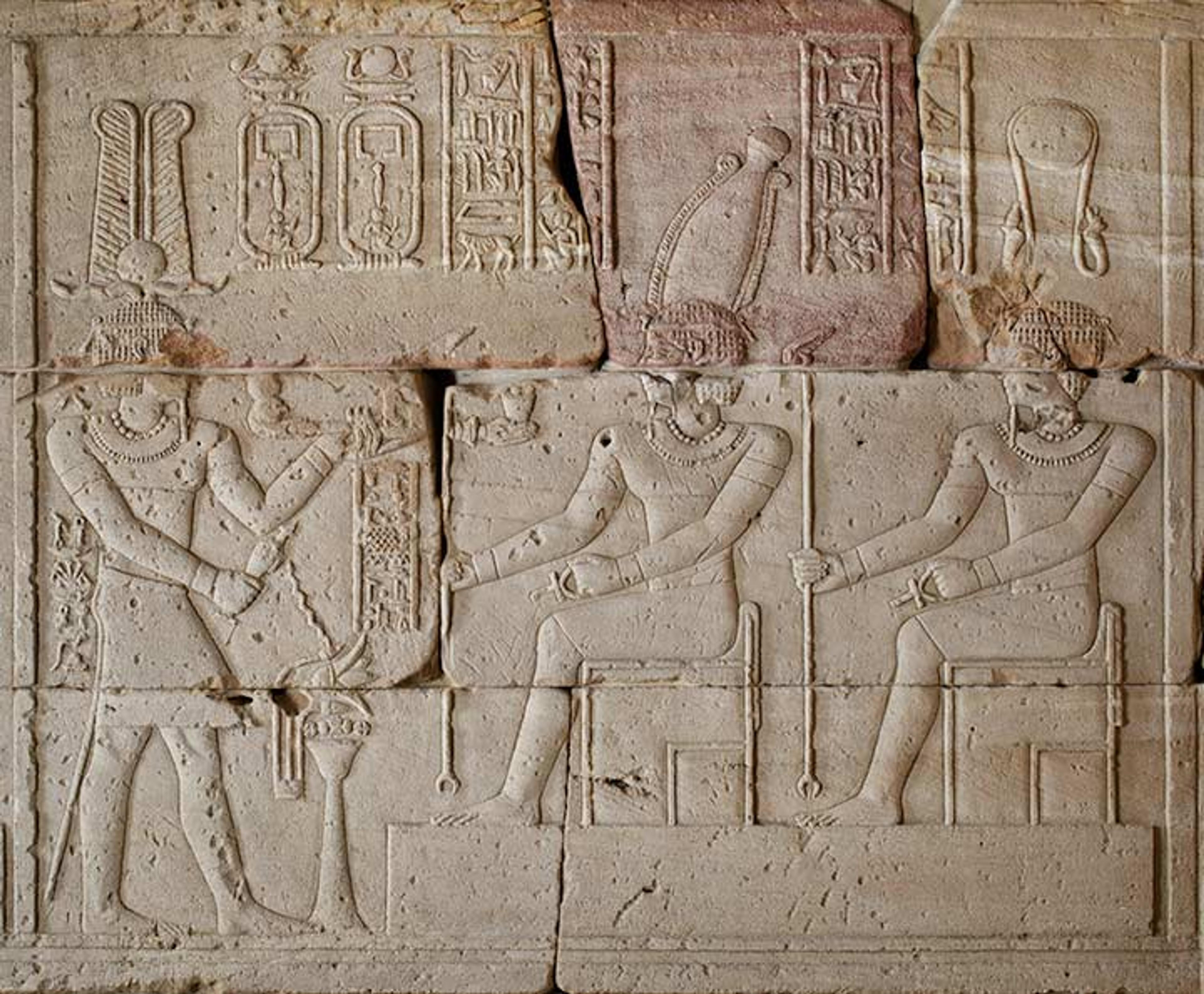 Augustus (on the right) offers wine to the deities Thoth (center) and Tefnut (left).
