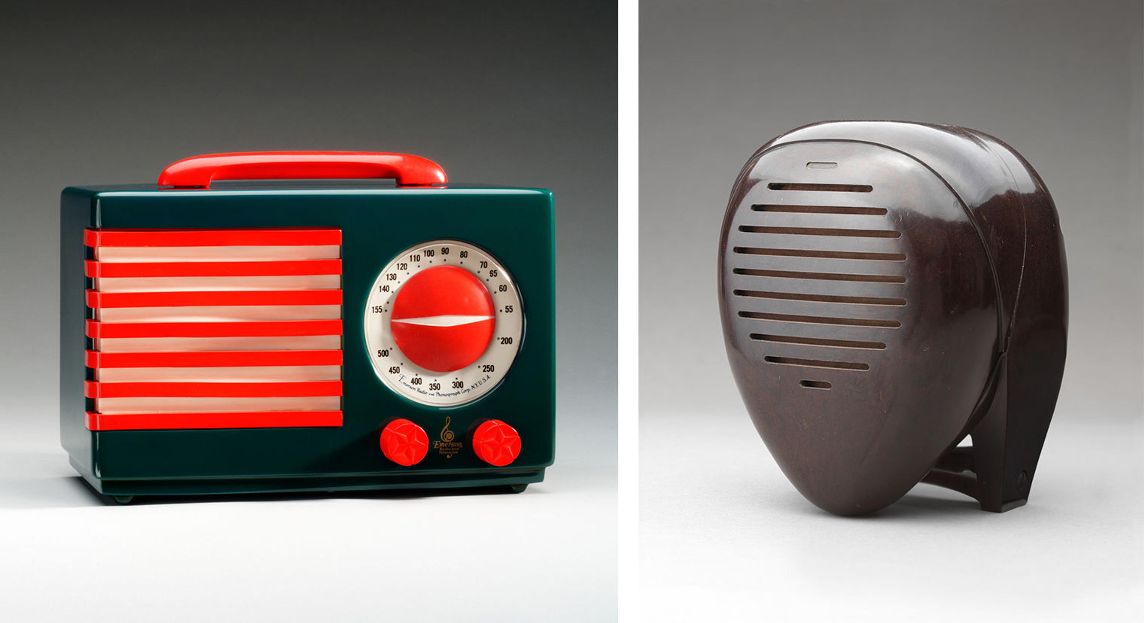 Left: Designed by Norman Bel Geddes (American, 1893–1958). Manufactured by Emerson Radio and Phonograph Corp., NewYork “Patriot” radio, ca. 1940. Catalin 8 × 11 × 51/2 in. (20.3 × 27.9 × 14 cm). The Metropolitan Museum of Art, New York, John C. Waddell Collection, Gift of John C. Waddell, 2001 (2001.722.11). Right: Designed by Isamu Noguchi (American, 1904–1988). Manufactured by Zenith Radio Corporation, Chicago; Kurz-Kasch, Inc., Dayton, Ohio; and Chicago Molded Products Corporation “Radio Nurse” monitor, 1937. Bakelite and cellulose acetate 8 × 61/2 × 61/2 in. (20.3 × 16.5 × 16.5 cm). The Metropolitan Museum of Art, New York, John C. Waddell Collection, Gift of John C. Waddell, 2000 (2000.600.14)