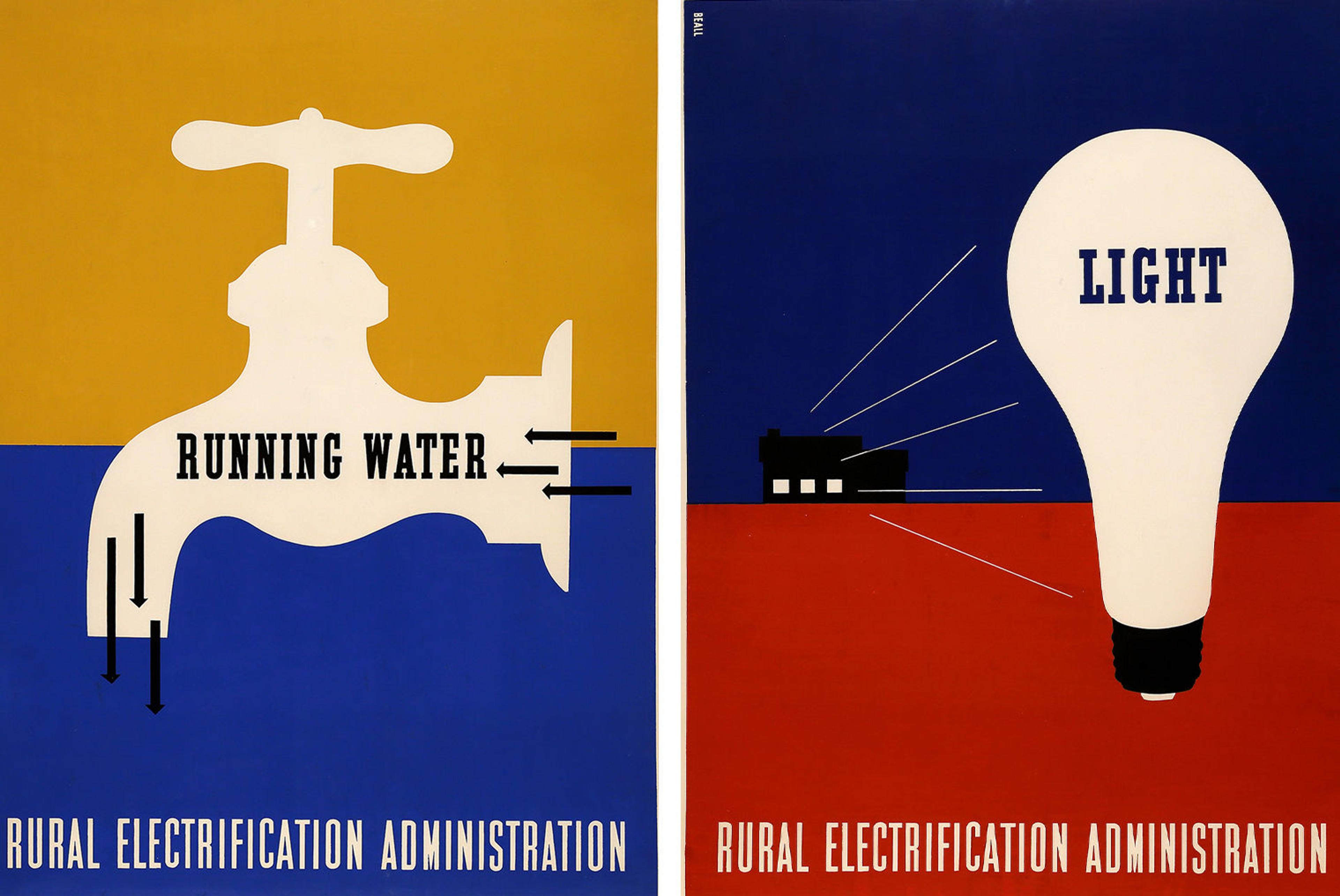 Left: Lester Beall (American, 1903–1969). Rural Electrification Administration, Running Water poster, 1937. Screenprint, 40 × 301/8 in. (101.6 × 76.5 cm). Merrill C. Berman Collection, Rye, N.Y.Right: Lester Beall (American, 1903–1969). Rural Electrification Administration, Light poster, 1937. Screenprint 397/8 × 301/8 in. (101.3 × 76.5 cm) Merrill C. Berman Collection, Rye, N.Y.