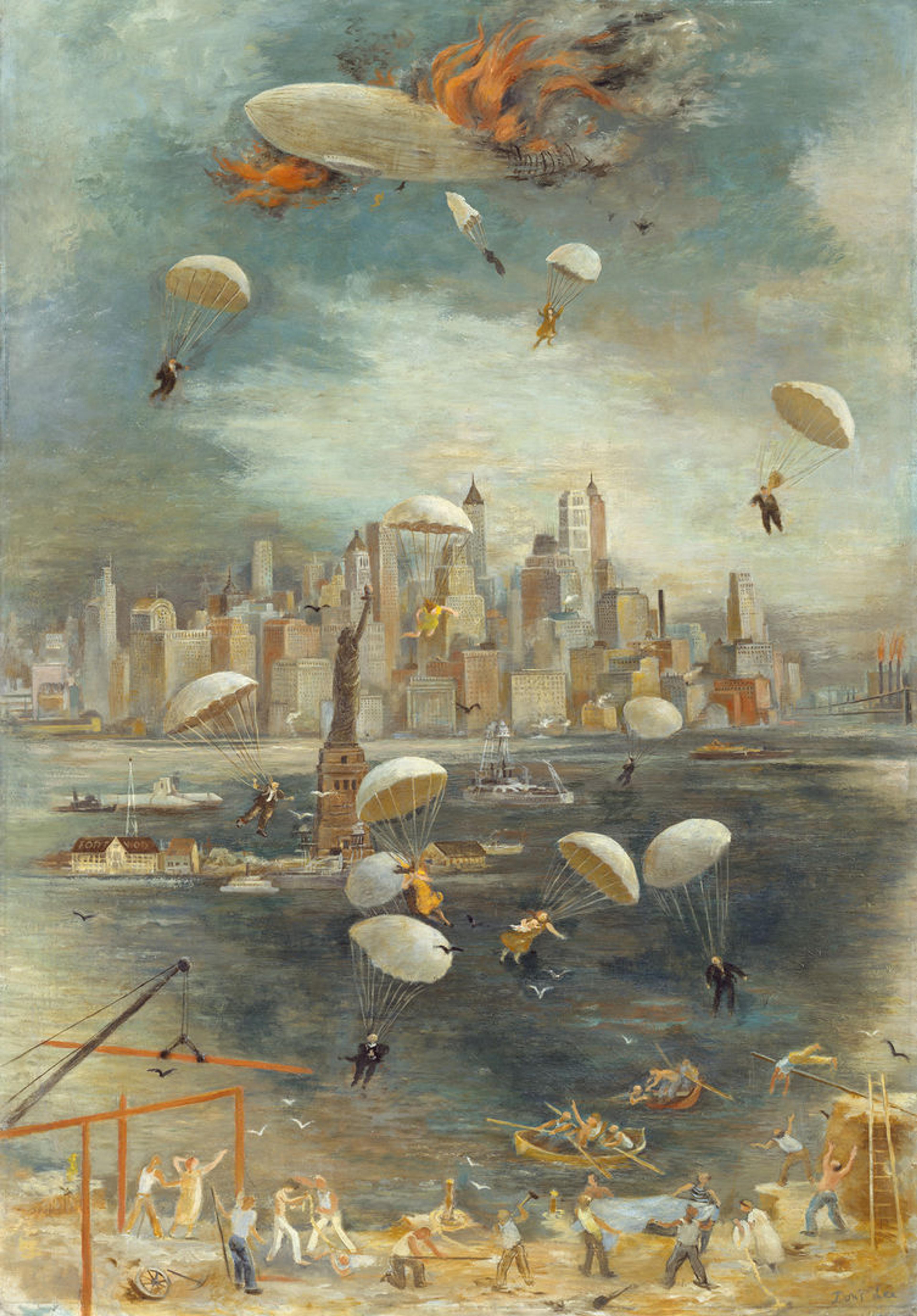 Doris Lee’s Catastrophe (1936) provides an explicit yet whimsical indictment of the ambitious race to construct towering buildings and soaring aircrafts. A dirigible has burst into flames above the Manhattan skyline, hovering in the air as figures with parachutes descend onto the banks of the Hudson River. Lee, a painter and successful commercial artist known for her humor and feminist politics, completed this prescient vision just a few months before the Hindenburg disaster. Indeed, a Time magazine article from June 1937 reported that when the artist was painting “the Manhattan skyline last August, she saw the Hindenburg fly over and imagined how it would look if it exploded.” Viewed through the lens of Lee’s feminism, Catastrophe can also be read as a critique of the power-hungry impulses that drove technological advances associated with masculinity. The work also seems to prophesy the tragic extreme to which these impulses would be taken almost a decade later with the introduction of the atomic bomb.