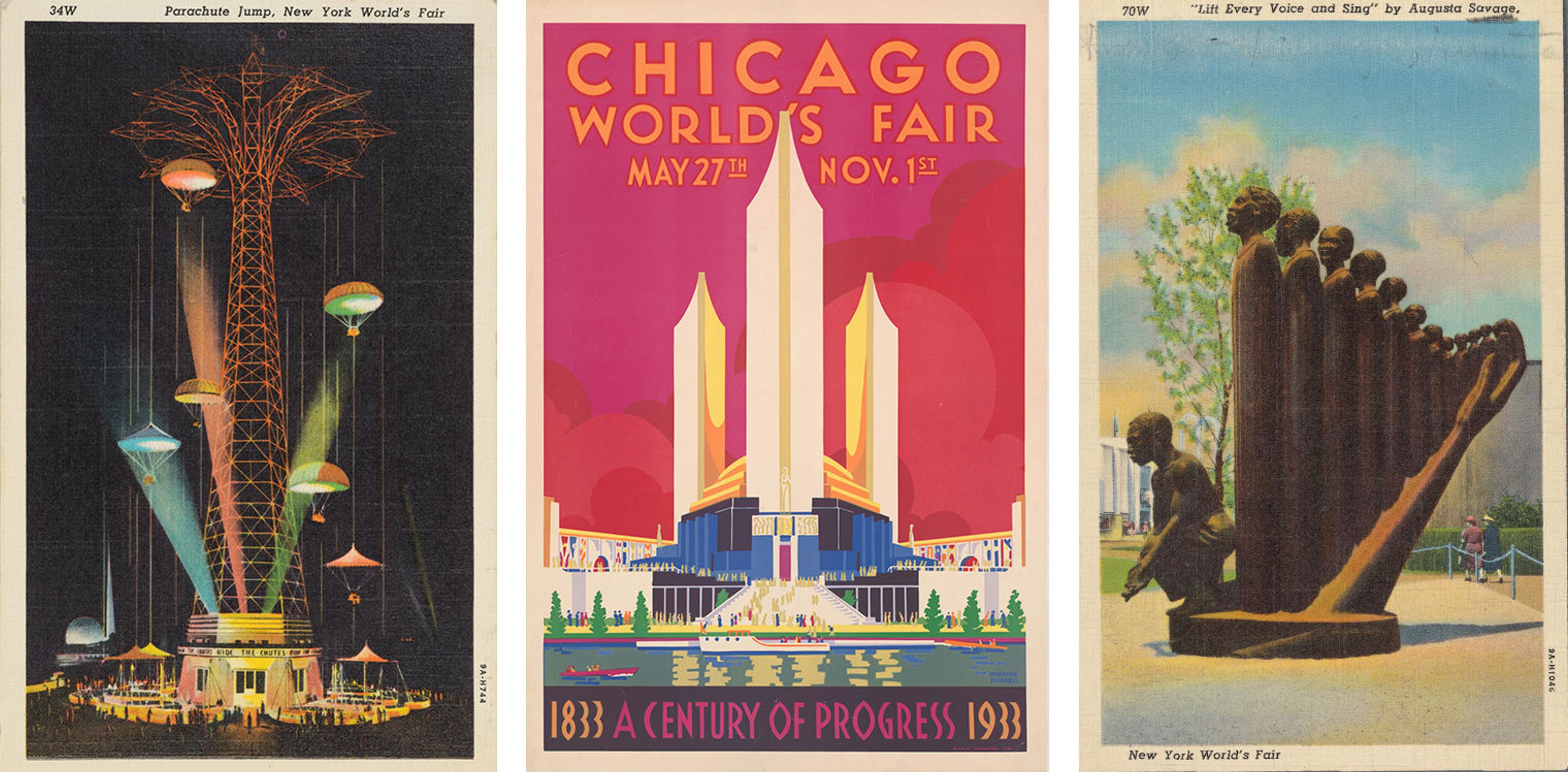 Left: Published by Interborough News Company, New York. Printed by C. T. Art-Colortone, Chicago. Parachute Jump, New York World’s Fair postcard, 1939. Offset lithograph 51/2 × 39/16 in. (14 × 9 cm). The Metropolitan Museum of Art, New York, The Jefferson R. Burdick Collection, Gift of Jefferson R. Burdick (Burdick 435, PC225-6.39). Middle: Weimer Pursell (American, 1906–1974). Chicago World’s Fair, A Century of Progress poster, 1933. Screenprint, 421/8 × 283/8 in. (107 × 72 cm). Library of Congress, Prints and Photographs Division, Washington, D.C. Right: Published by Frank E. Cooper, NewYork Printed by C. T. Art-Colortone, Chicago “Lift Every Voice and Sing (The Harp)” by Augusta Savage, New York World’s Fair postcard, 1939. Offset lithograph 51/2 × 39/16 in. (14 × 9 cm). Art and Artifacts Division, Schomburg Center for Research in Black Culture, The New York Public Library, Astor, Lenox and Tilden Foundations