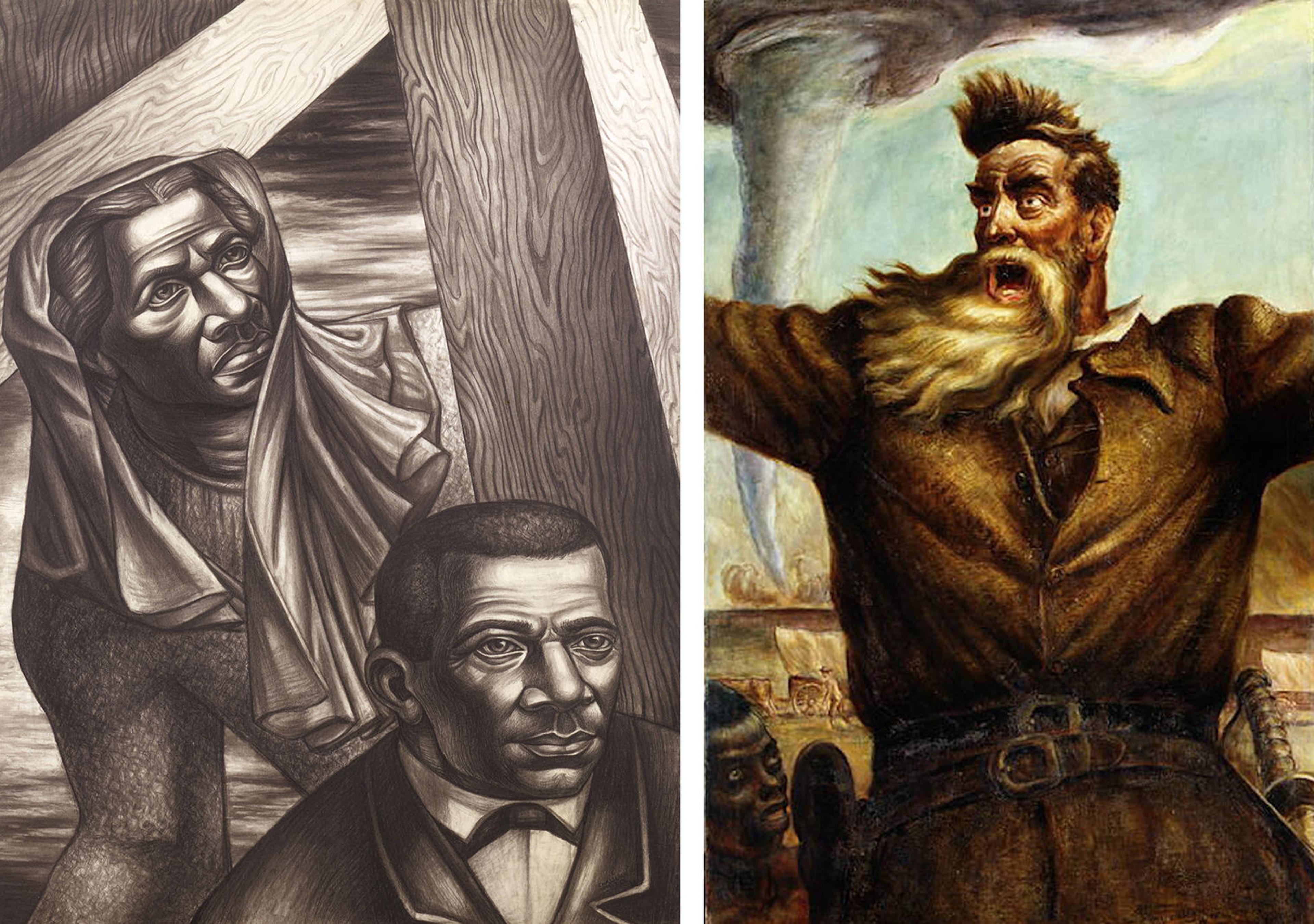 Left: Charles White (American, 1918–1979). Sojourner Truth and Booker T. Washington, 1943. Graphite on paperboard, 375/8 × 28 in. (95.6 × 71.1 cm). The Newark Museum of Art, N.J., Purchase, 1944, Sophronia Anderson Bequest Fund. Right: John Steuart Curry (American, 1897–1946). John Brown, 1939. Oil on canvas, 69 × 45 in. (175.3 × 114.3 cm). The Metropolitan Museum of Art, New York, Arthur Hoppock Hearn Fund, 1950 (50.94.1)