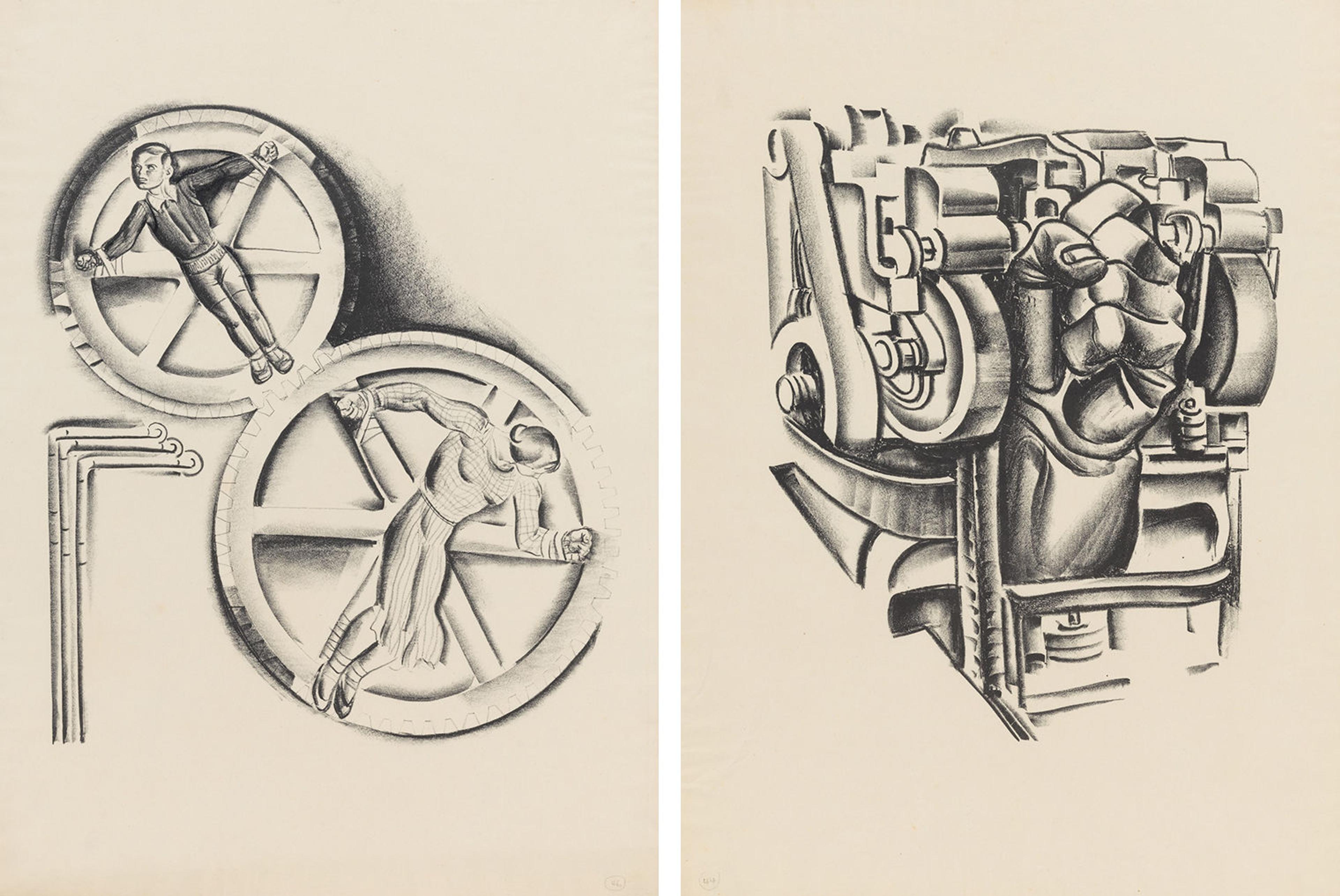 Left: Hugo Gellert (American, born Hungary, 1892–1985). Machinery and Large Scale Industry 46, 1933. Lithograph, 201/4 × 15 in. (51.4 × 38.1 cm). The Metropolitan Museum of Art, New York, Gift of Abner and Miriam Diamond, 1998 (1998.392.5). Right: Hugo Gellert (American, born Hungary, 1892–1985). Machinery and Large Scale Industry 44, 1933. Lithograph, 201/4 × 15 in. (51.4 × 38.1 cm). The Metropolitan Museum of Art, New York, Gift of Abner and Miriam Diamond, 1998 (1998.392.4)