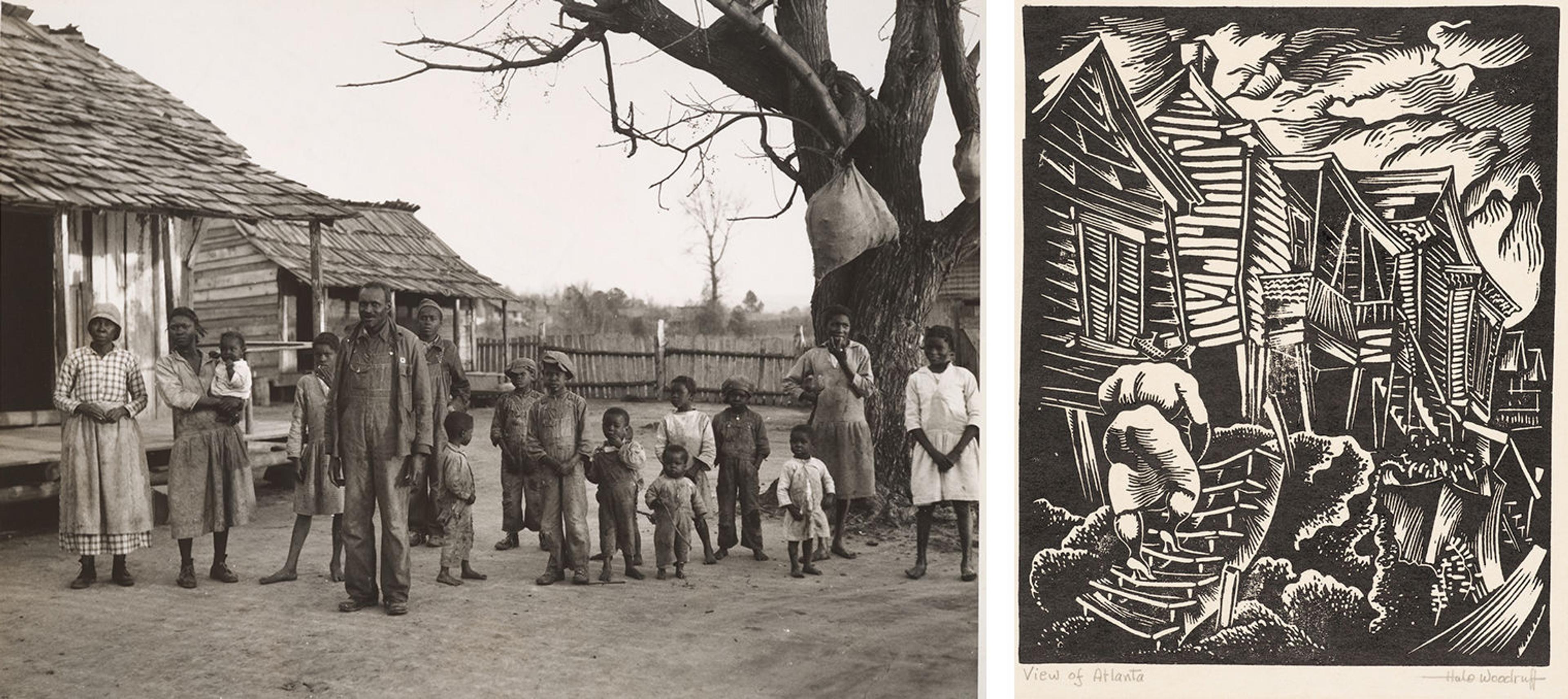 Left: Arthur Rothstein (American, 1915–1985). African American Family at Gee’s Bend, Alabama, 1937. Gelatin silver print, 71/8 × 91/2 in. (18.1 × 24.1 cm). The Metropolitan Museum of Art, New York, Purchase, Alfred Stieglitz Society Gifts, 2001 (2001.298). Right: Hale Woodruff (American, 1900–1980). View of Atlanta, 1935 Linocut, 97/8 × 8 in. (25.1 × 20.3 cm). The Metropolitan Museum of Art, New York, Gift of Reba and Dave Williams, 1999 (1999.529.201)