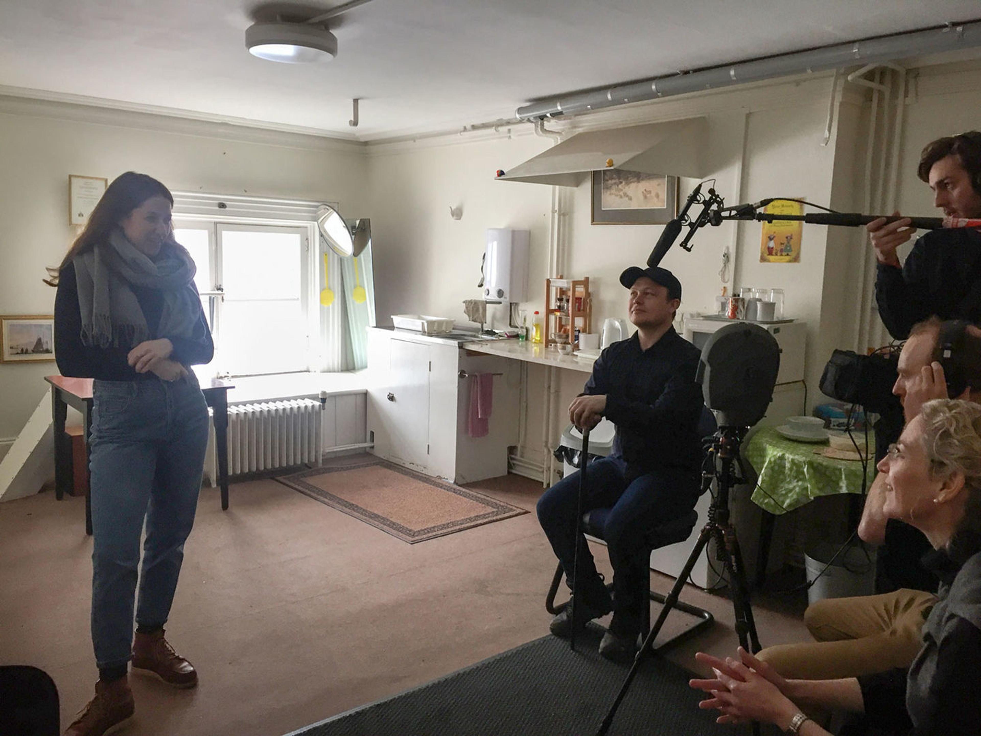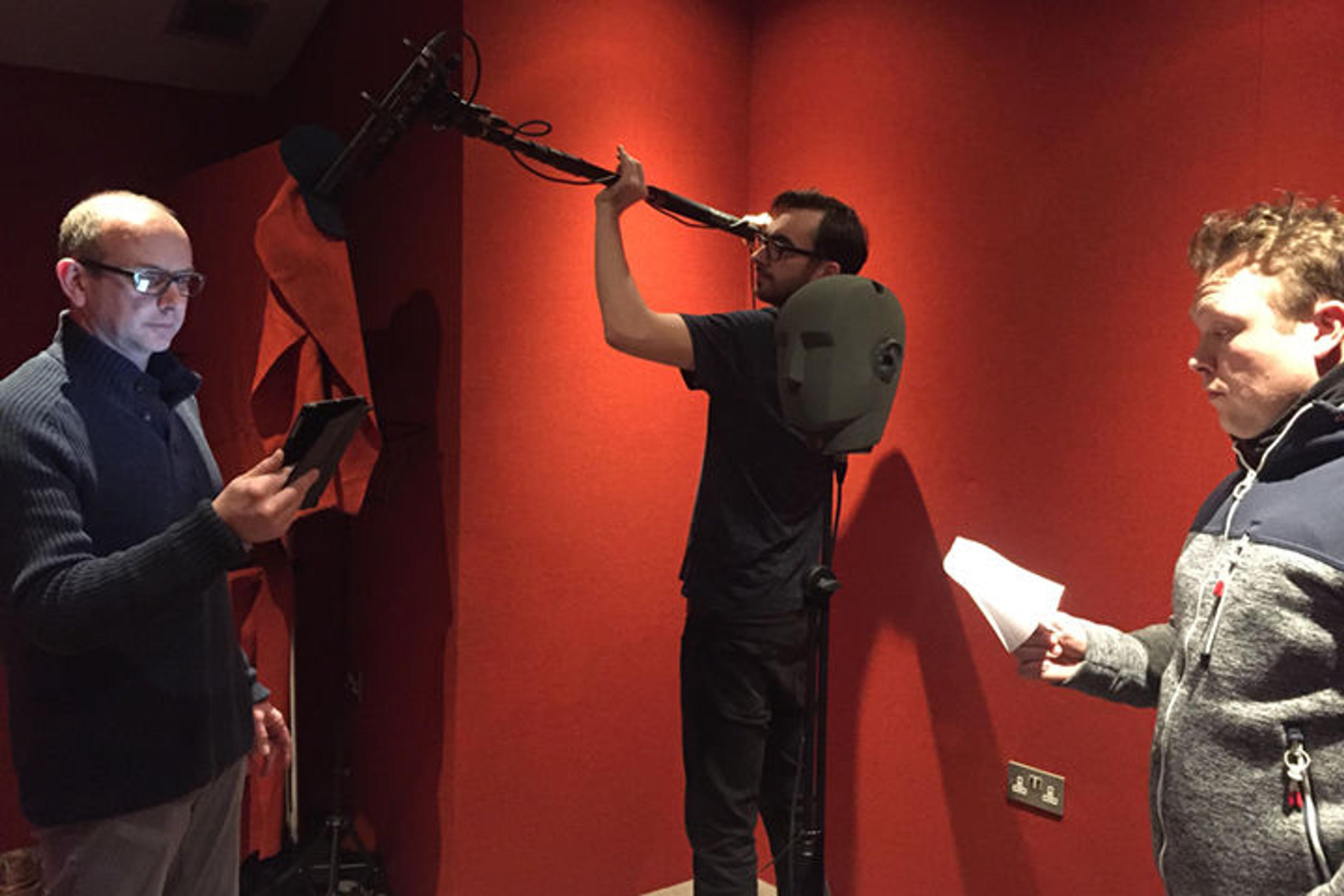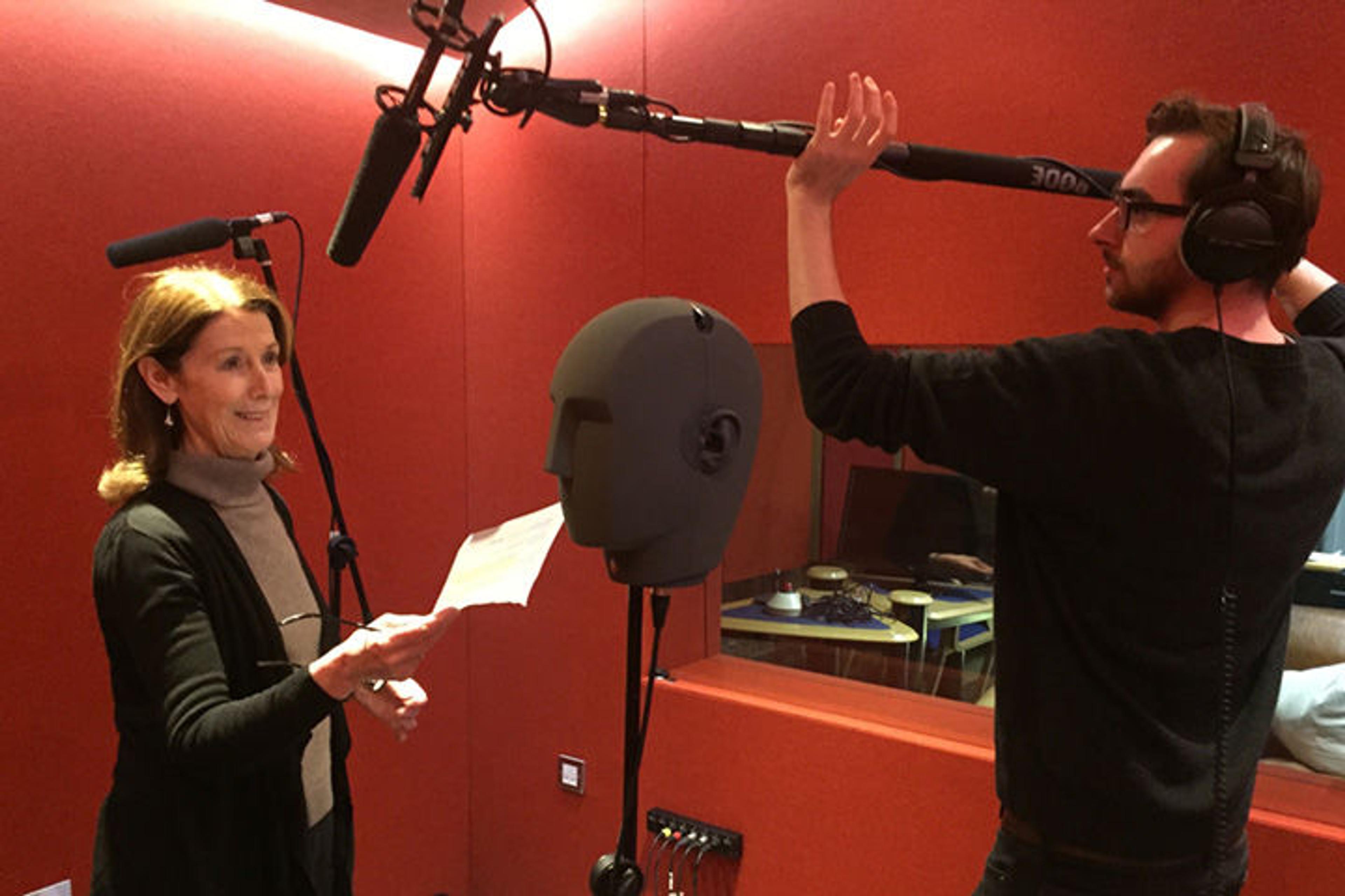 Days later, we were ready to record actors performing the script. Based on our choreography, Chris coached them how to move around the head, and how close to get to its two microphones. Daniel and I listened to each take and gave direction from the control desk.