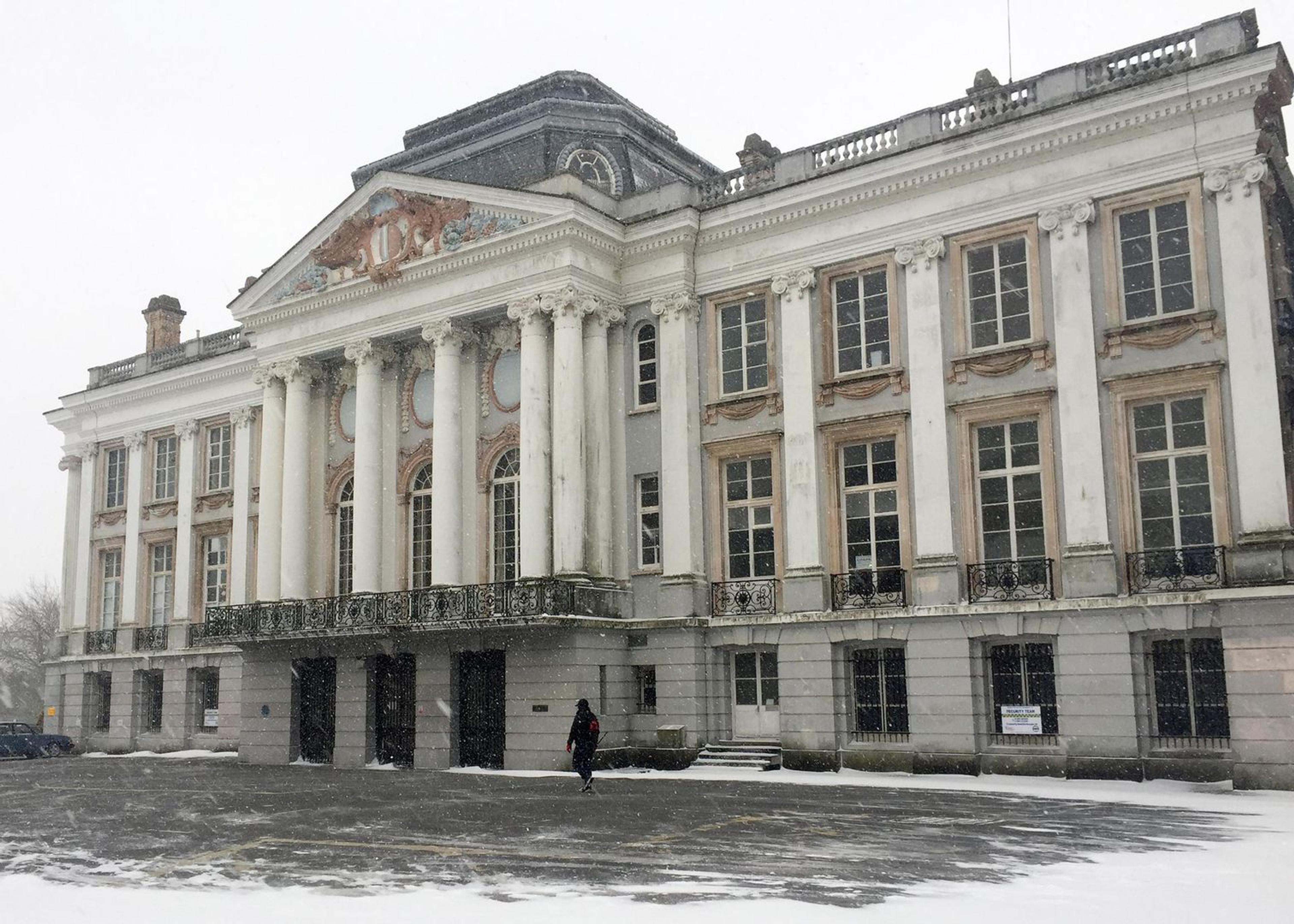 The exterior of Oldway Mansion in Paignton, Devon, England, as seen through snow thrown by the storm nicknamed the "Beast from the East." Photo by Nina Diamond