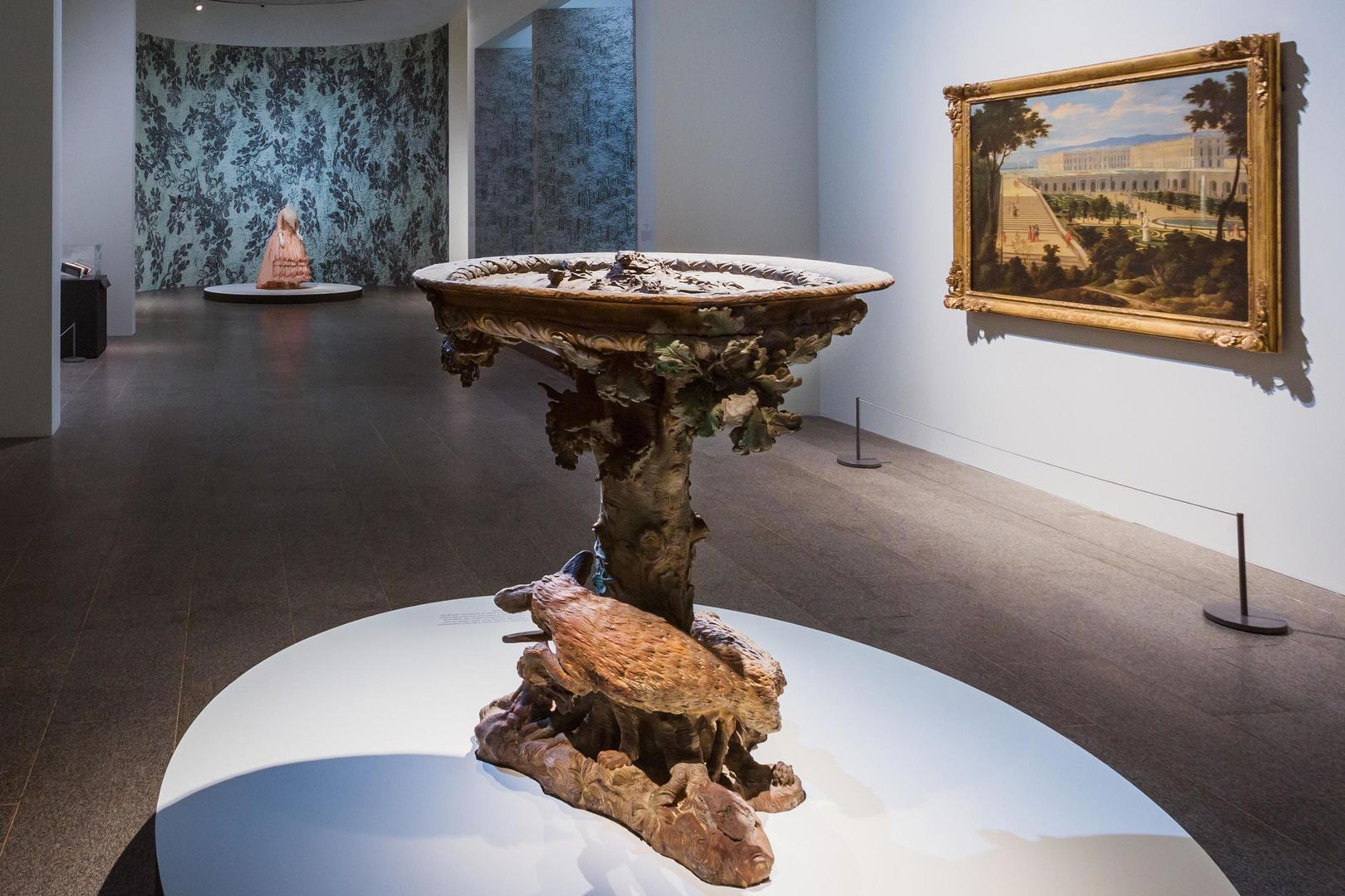 The soundscape devoted to "The Gardens" gallery reflects research into the actual animals that were in the royal menagerie. At center: Fox Setting Fire to the Tree with the Eagle's Nest, 1673–74. French. Painted lead, 47 1/4 x 33 1/16 in. (120 x 84 cm). Musée National des Châteaux de Versailles et de Trianon (MV 7946.1)