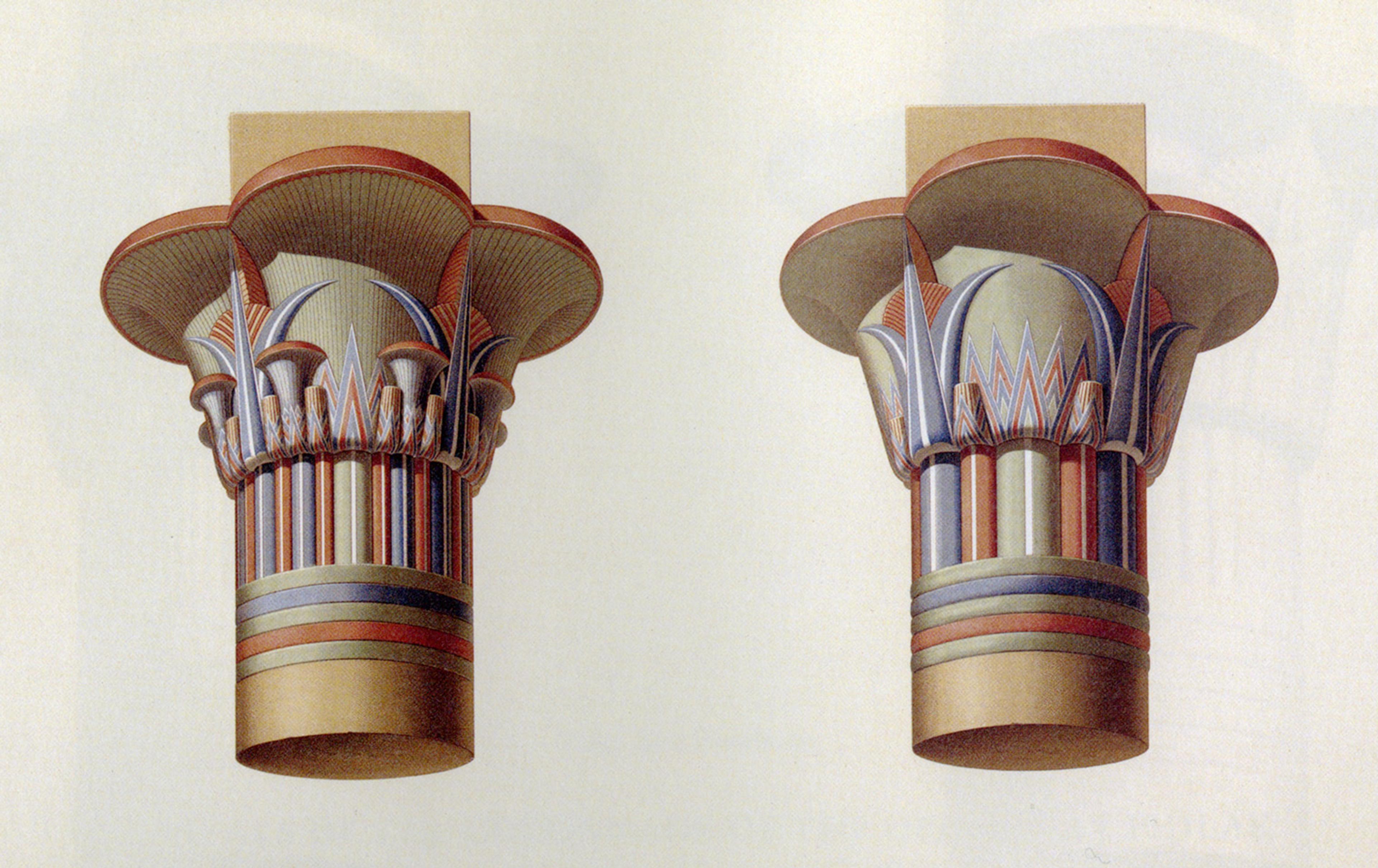 Composite capitals from columns in the temple of Isis on the island of Philae. Plate 58 from Emile Prisse d'Avennes, Histoire de l'art égyptien (Paris, 1878–79)