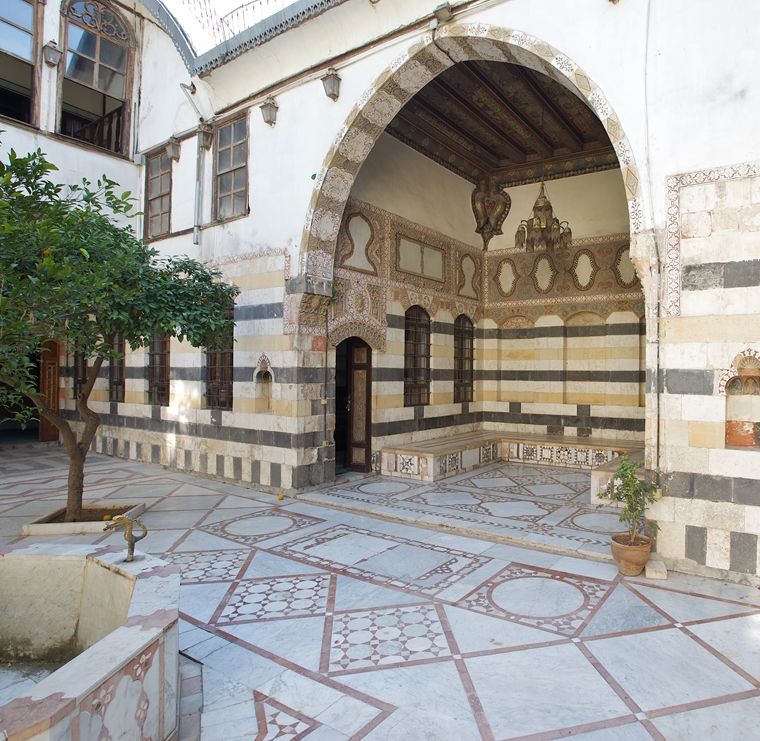 For many centuries, courtyard houses in Damascus adhered to a general design: an understated exterior with a first story of masonry and one or more upper stories of timber and sun-dried brick coated with plaster and whitewash. Even the most elegant residences appeared unassuming from the street. Inside, however, many houses featured sumptuous private courtyards surrounded by living spaces, usually on two floors.