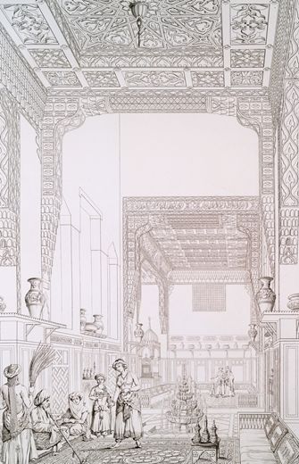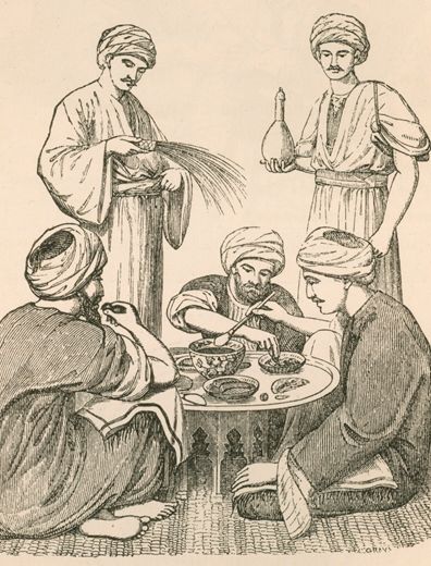 Left: Reception view, illustration from The Natural History of Aleppo: Containing a Description of the City and the Principle Natural Productions in its Neighborhood by Alexander Russell, 1794. Right: Washing hands, illustration from The Land and the Book by W. M. Thomson, 1888.