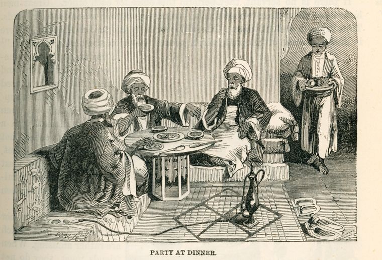 Party at dinner, illustration from The Land and the Book by W. M. Thomson, 1888.