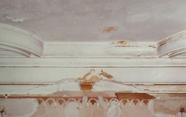 Image: Detail of the stylized red ivy leaf border and medallion ceiling, as found in the house. American Wing curatorial files