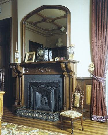 The oak mirror currently above the mantel was designed around 1840 by the architect Alexander Jackson Davis for Knoll (now Lyndhurst), a distinguished Gothic Revival residence located in Tarrytown, New York. The Gothic Revival cast-iron grate was probably made in New York state.
