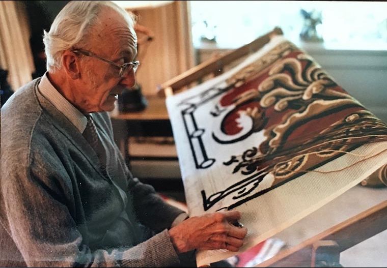 Sam Dornsife working on the hearth rug, 1983. American Wing curatorial files.