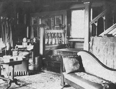 Interior view of the parlor at Hillcrest, the Summit, New Jersey, home of Worthington and Euphemia Foot Whittredge. Photograph, ca. 1900. Note the couch on the right with woven designs in the seat and back fabric. American Wing curatorial files.