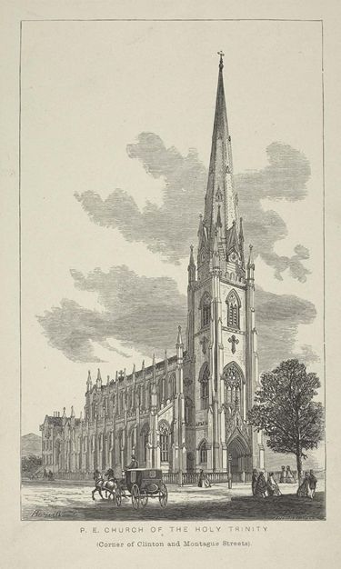 Image: Engraved by J.P. Davis & Speer, after Charles E. H. Bonwill, (b. ca. 1836). P.E. Church of the Holy Trinity, (corner of Clinton and Montague Streets). Wood engraving, 23.4 x 16.2 cm. From The New York Public Library