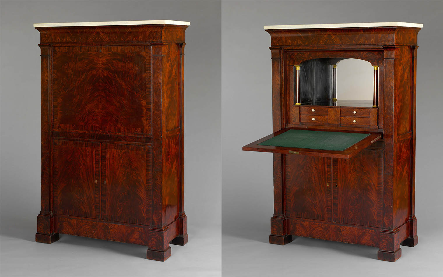 Attributed to the Workshop of Duncan Phyfe (American, born Scotland 1770–1854), D. Phyfe & Sons (1837–40), or D. Phyfe & Son (1841–47). Secrétaire à abattant. New York 1835–47. Mahogany, yellow poplar, white pine, gilded brass, mirrored plate glass, marble, ivory, 62 x 39 1/4 x 18 7/8 in. (157.5 x 99.7 x 47.9 cm). The Metropolitan Museum of Art, New York, Purchase, The Manney Collection Gift, 1983 (1983.225)