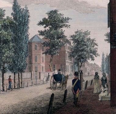 Image: The Powel House, with later addition is seen here in this detail of an engraving by Thomas and William Birch entitled View in Third Street, from Spruce Street, 1800. The New York Public Library