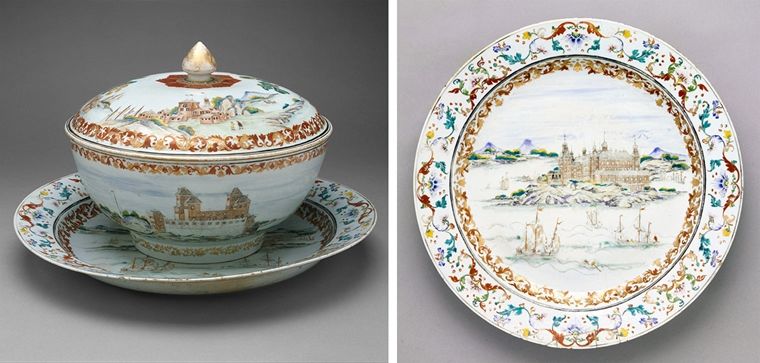 Left: Covered punch bowl, 1745–55. China. Porcelain. The Metropolitan Museum of Art, New York, Purchase, Joseph Pulitzer Bequest, 1940 (40.133.1a, b). Right: Platter, 1745–55. China. Porcelain. The Metropolitan Museum of Art, New York, Purchase, Joseph Pulitzer Bequest, 1940 (40.133.2)