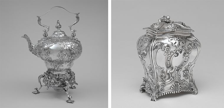 Left: Benjamin Brewood II (London, active from 1755). Teakettle. 1762–63. Silver. The Metropolitan Museum of Art, New York, Gift of Mrs. Ernest R. Adee, 1940 (40.160a). Right: Emik Romer (Norwegian, active London). Tea canister, 1762–63. Silver. The Metropolitan Museum of Art, New York, Gift of William S. Verplanck, 1959 (59.30)
