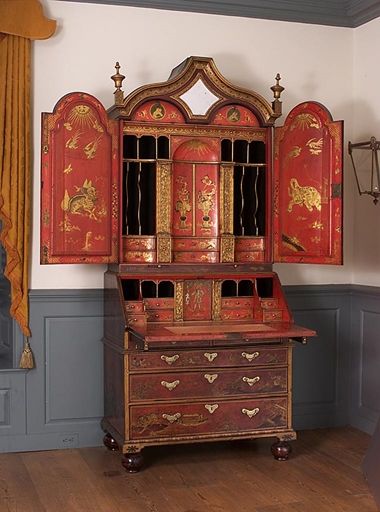 In 1753 Lieutenant Governor James De Lancey, a grandfather of Mrs. Daniel Verplanck (daughter-in-law to Samuel and Judith), bought this desk and bookcase at an auction. All the items offered for sale had belonged to Sir Danvers Osborne, a colonial governor of New York. Osborne had transported his household furnishings from England to New York City but committed suicide shortly after assuming his post as governor in 1753.