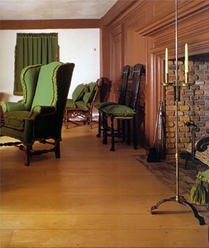 Originally a best chamber, or bedroom, on the second floor, the Wentworth Room is one of the largest domestic interiors surviving from the early colonial period. Early eighteenth-century diaries reveal the best chamber was used for dining and entertaining in addition to sleeping. The room probably contained a high bedstead with a handsome set of bed hangings, but this installation has omitted the bed in order to show a variety of new furniture forms and the range of activities that took place in the room.