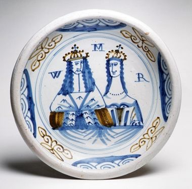 Image: Dish, ca. 1690. Probably British, Lambeth. King William and Queen Mary depicted on tin-glazed earthenware (delftware). The Metropolitan Museum of Art, New York, Purchase of Anita M. Linzee, Bequest, 1937 (37.13.3)