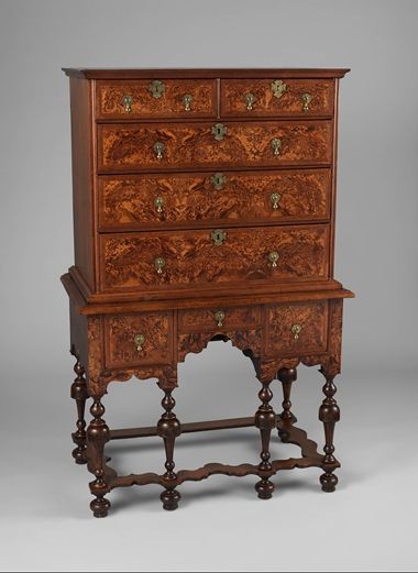 Furniture in the "William and Mary style," as it commonly became known in the United States, showed a vertical rather than horizontal emphasis, and became lighter in scale. Reflecting the movement and three-dimensional quality of Baroque designs, furniture was no longer confined to strictly rectilinear shapes, like that seen in the Hart Room (Gallery 709). Curves enlivened "Spanish" feet on chairs, scrolling carved chair crests, and the skirts and stretchers of high chests. In case furniture, such as chests and desks, the William and Mary style featured trim lines and large smooth surfaces, which were achieved by abandoning the panel-and-frame tradition and replacing it with finer dovetailed board construction. Walnut and maple became favored over oak, and their natural wood grains (especially burled examples) became valued for their decorative qualities, showcased by the use of veneers.