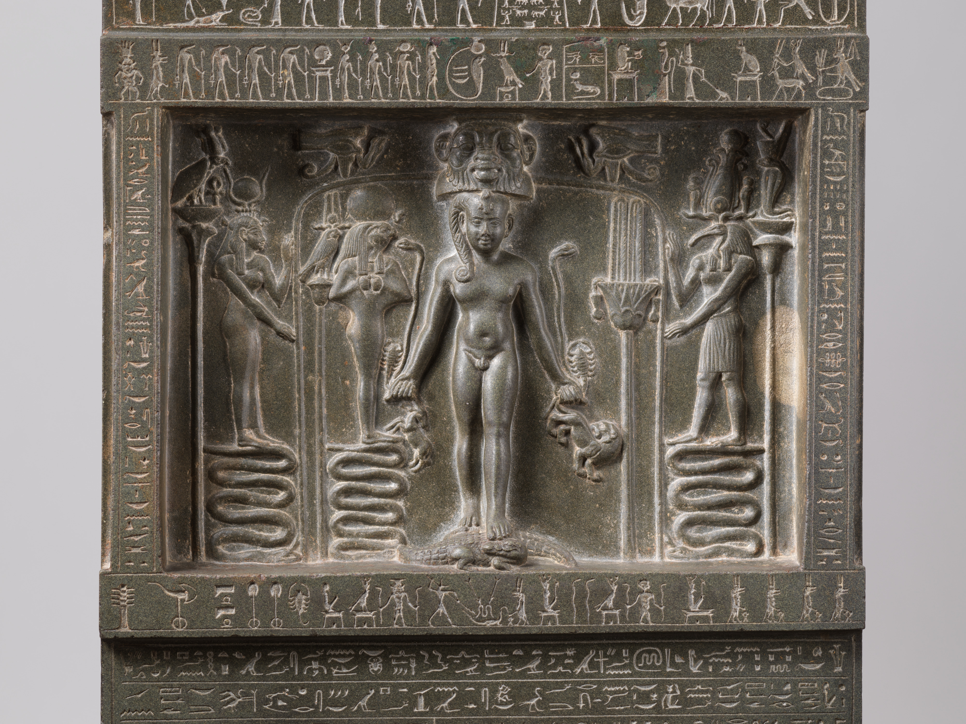 The top half of this stela was skillfully carved in the hard dark stone. On the part below the central figure panel, rows of hieroglyphs record thirteen magic spells to protect against venomous bites and wounds and to cure the illnesses caused by them. The stela was commissioned by the priest Esatum to be set up in the public part of a temple. A victim could recite or drink water that had been poured over the magic words and images on the stela. As a mythic precedent, the hieroglyphic inscription around the base describes the magic cure that was worked upon the infant Horus by Thoth, the god of wisdom and writing.
